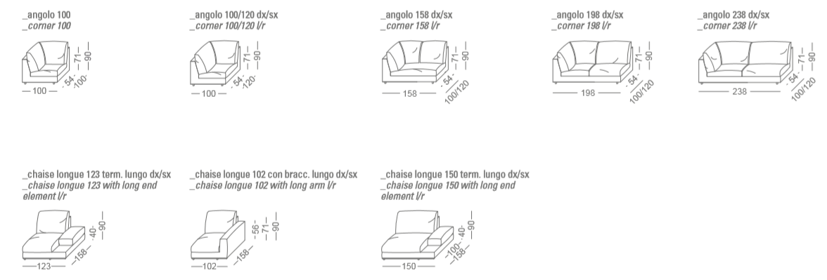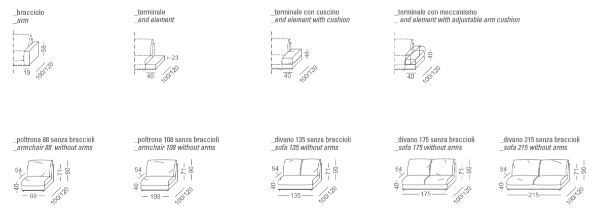 The most interesting features of the 810 Fly sofa are its wide and soft seat cushions with smooth and reassuring lines in every arrangement. Also, the sofa is available with traditional armrests or reclining armrests (with an appropriate mechanism); otherwise, the side end of the sofa can be equipped with cushions that can be used as seats when neeeded. Independent elements make this sofa suitable to furnish rooms of your home, attic loft or apartment having unusual corners.