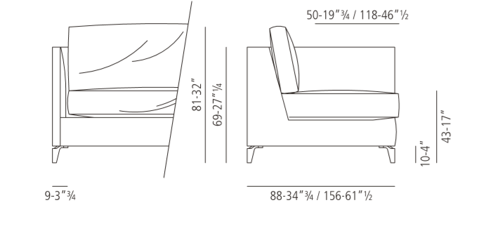 The most interesting features of the 910 ZONE Slim sofa are its high and slim armrests, the Canaletto wood or aluminium feet and the possibility to combine the sofa with large accessory elements, chaise-longues and ottomans.