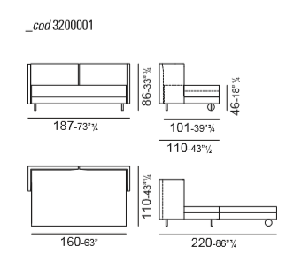 The 3200 Book sofa bed can be covered choosing from an endless range of fabrics available in all the trendiest colours. This sofa bed can have cordonnet thread piping, also in a contrasting colour. Covers are available in the most requested materials: leather, cotton, linen, all of which are top quality handcrafted, sartorial products. The sofa's padding, seat and backrest cushions and the mattress are filled with polyurethane foam wrapped by thermal bonded fibre.