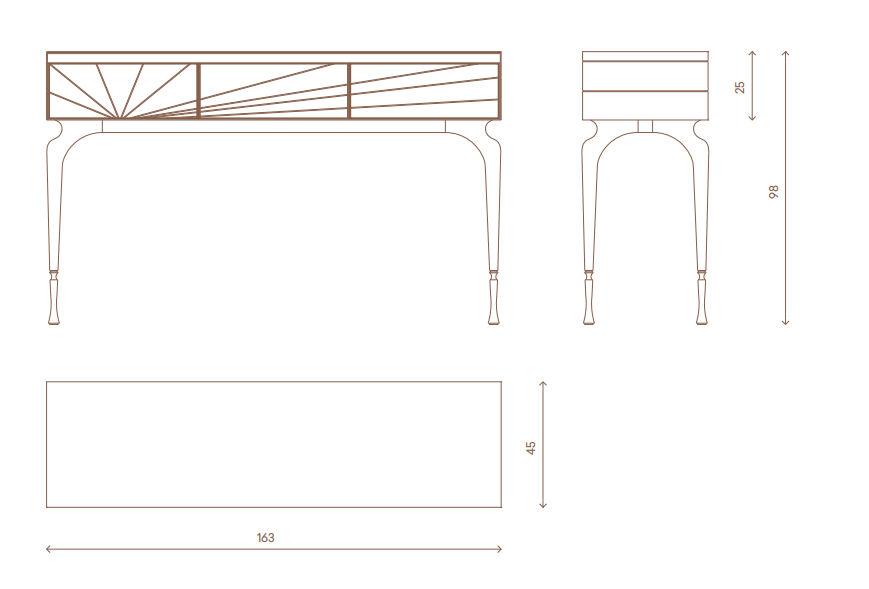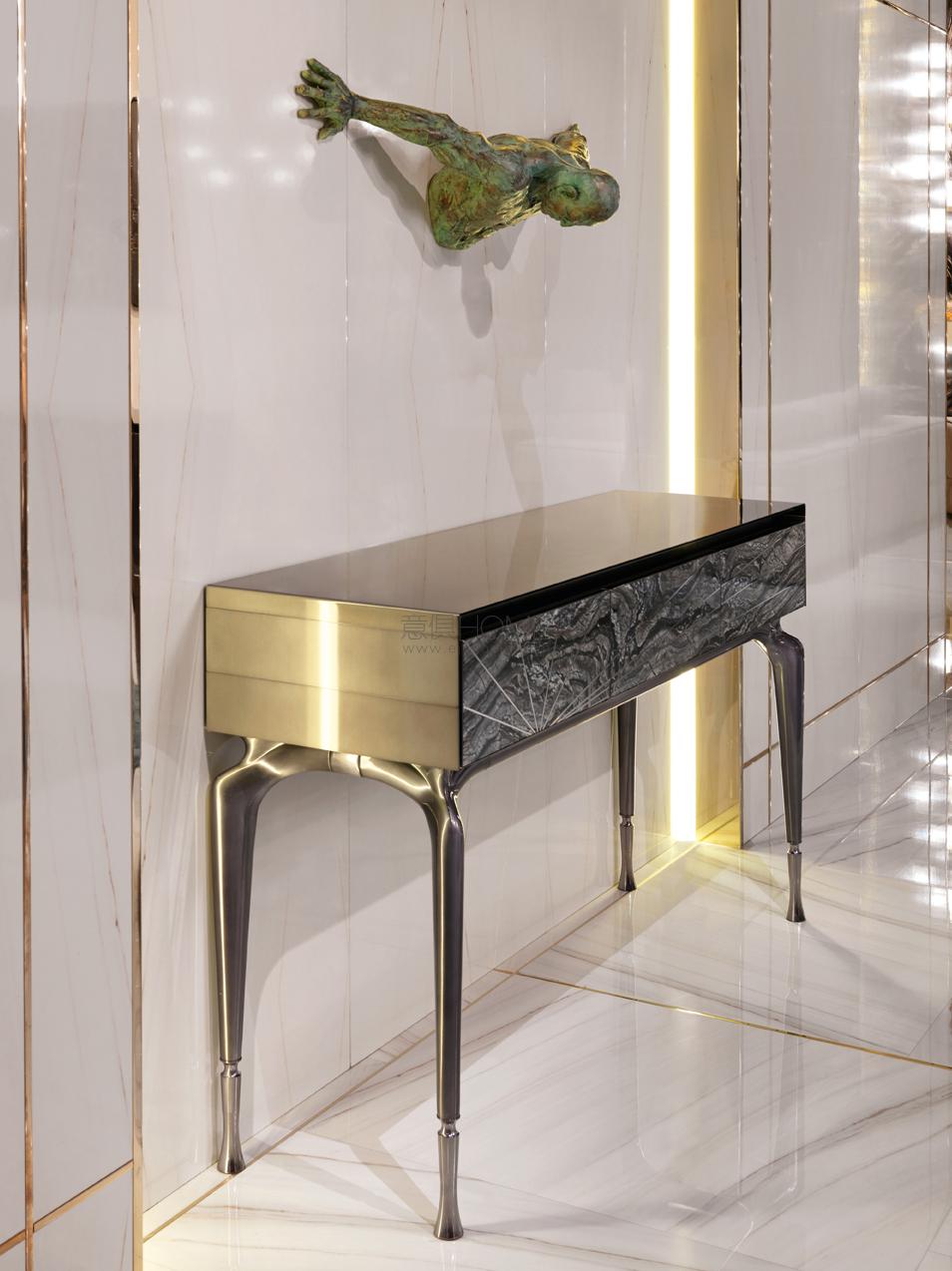 Wooden console with three drawers covered in brushed stainless steel, internal and back part in lacquered mat (RAL colours). Drawers covered in marble, framed and inlayed in stainless steel. The inlay design continues on the sides. Legs in polished aluminium cast with fifinal tips in brushed aluminium. All metal details are available in gold, bronze or black nickel fifinishing