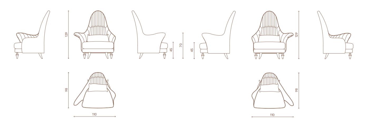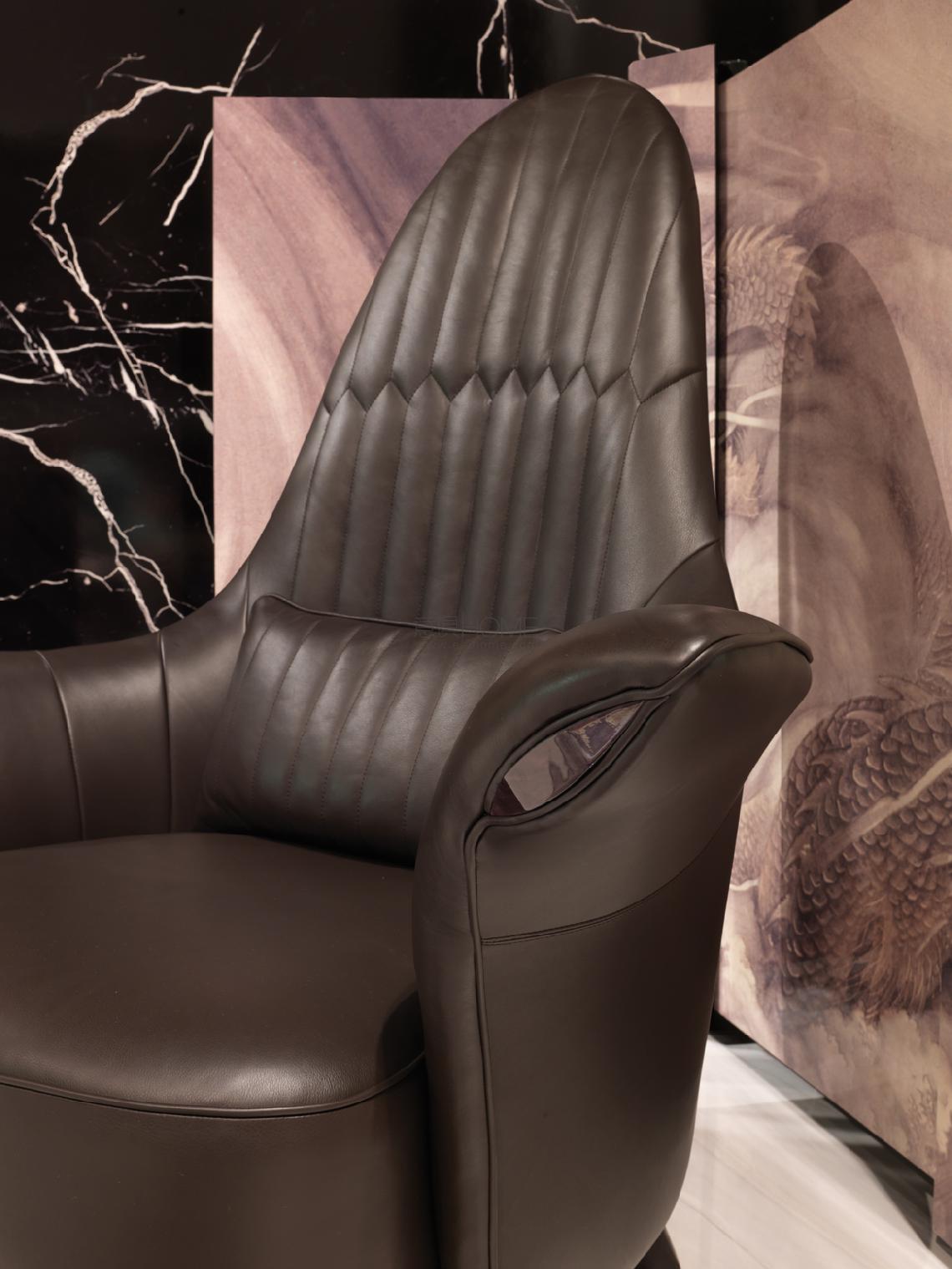 Structure in plywood and in solid wood, polyurethane foam in different densities Memory Foam? and acrylic fifibre padding, backrest upholstery with capitonné rhombus pattern and seat cushion with light quilting. Back cushion in goose down, front feet in turned aluminium in chromed/golden/ bronzed fifinishing and rear feet covered with fabric or leather. Option: decorative insert in the armrest in semi-precious stone or briar wood/veneer