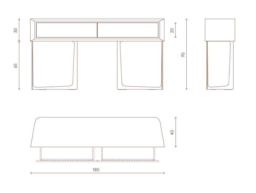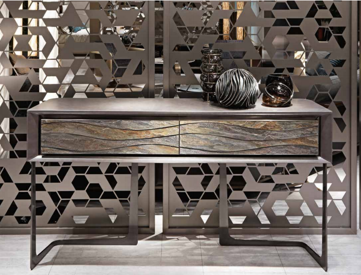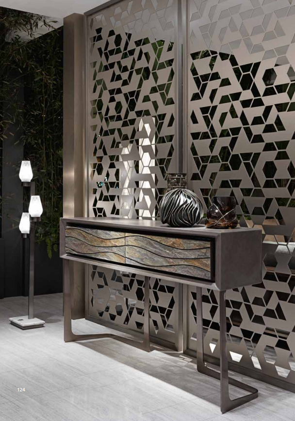 Console with 2 drawers, structure in plywood covered in leather or in lacquered wood, grooves and frames in satinized stainless steel, front decorative panels in marble or in natural cleft stone with inserts in shiny stainless steel. Legs in satinized stainless steel. Metal parts available in the satinized metal fifinishing selection.