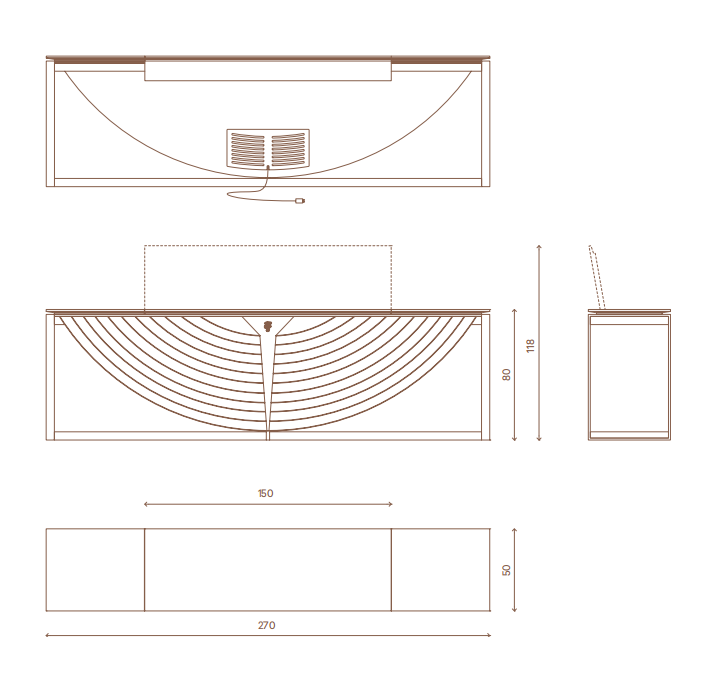 Bar console with structure in plywood and MDF lacquered in RAL or pearlized  colours or in veneer with shiny fifinishing. Front panel in marble with “arch”  manufacture, with inserts in natural stainless steel and in leather. Central  decoration and external frame in satinized stainless steel available in the  satinized metal fifinishing selection. Flap top with damped hinges and internal  part in mat lacquer with mirror bottom and shelves in extraclear crystal.  Predisposed for wall fifixing. Option: integrated Bluetooth audio system with  2 tweeter-mid range diffusers and 1 subwoofer unit (max 400W) with USB  sockets for recharge of portable devices.