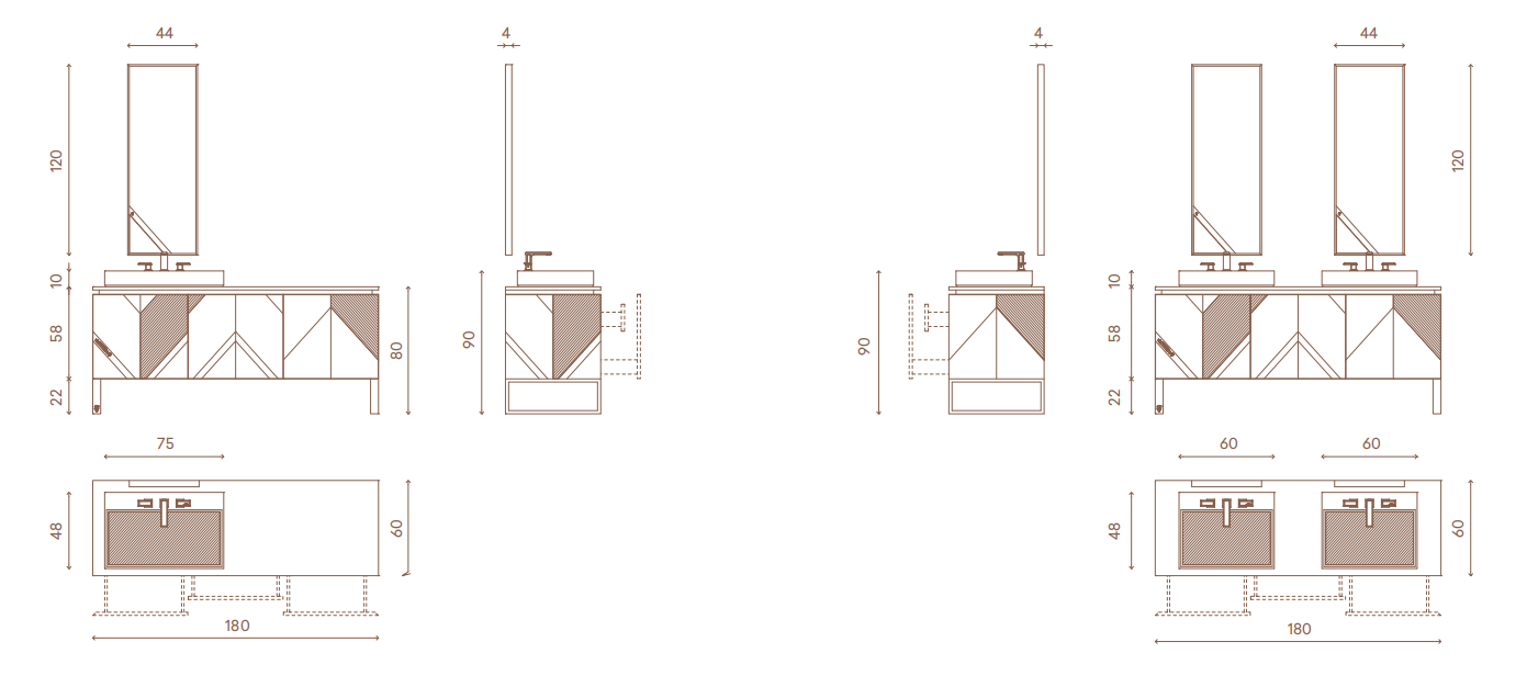 Structure in marine plywood panels with basket drawers and sides in glass/ steel with damped rails. Internal drawers in mat lacquered wood, front and  sides in marble with geometric pattern in bas-relief engraving and upper  borders covered with satinized stainless steel. Feet in satinized stainless steel.  Top and basin in marble obtained from solid marble in one single piece.  Taps available in: shiny chrome, shiny bronze, shiny black nickel, patinated  gunmetal, satinized Siena. Mirror with insert in marble and satinized stainless  steel with engraved Visionnaire logo, external borders in satinized stainless  steel. Metal parts available in the satinized metal fifinishing selection.