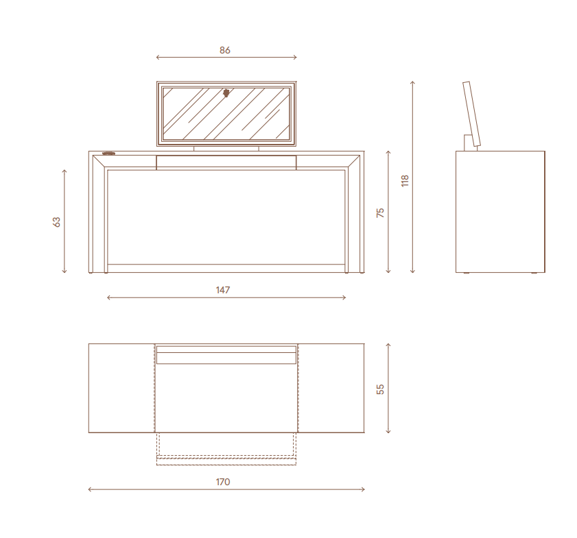 Structure in plywood and MDF fully covered in leather, internal drawer in mat lacquer (RAL colours), front built-in perimetral frame in mirror (natural/bronze/smoked). Rear back in mat lacquer, front frames in satinized stainless steel with laser Visionnaire logo. Desk pad in lacquered wood or veneered with shiny fifinishing. Upper mirror with perimetral profifile in satinized stainless steel, mirror with back-lightened LED edge, available with rear part in mat lacquer or covered in leather. Metal parts available in the satinized metal fifinishing selection. The desk pad is available in the veneer fifinishing selection.