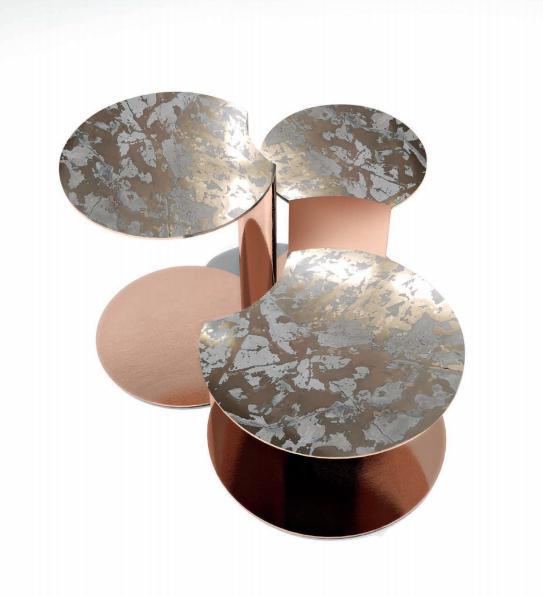 Set of three tables in different heights, with structure in stainless steel combining concave and convex surfaces. Bevelled and shaped top in marble. Tables of this set can be also purchased individually