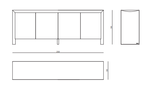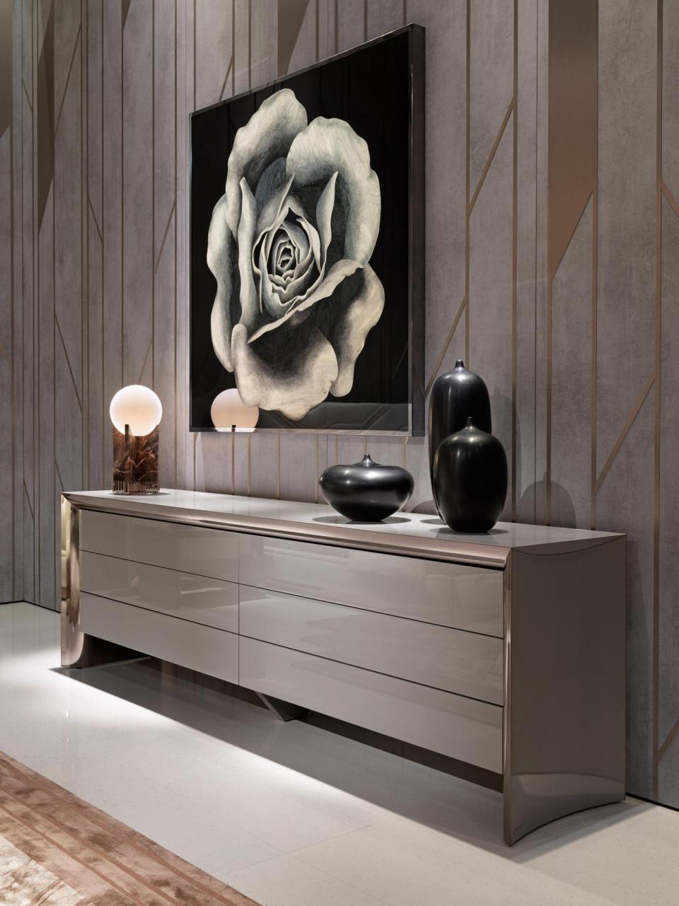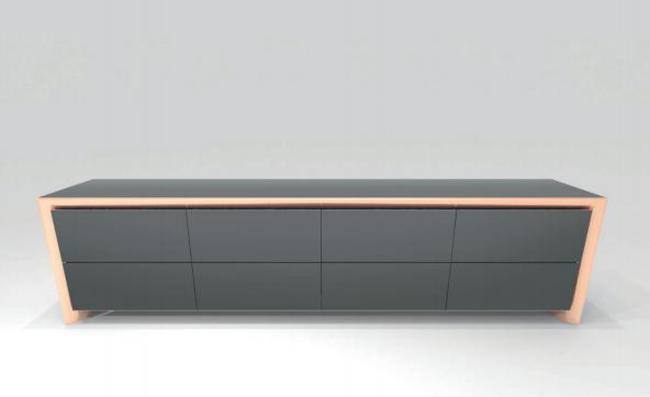 Cabinet with four doors, structure in wood with concave sides in veneered wood with 100 gloss hand-lacquered finish. Internal frame in curved stainless steel. Internal structure equipped with drawers lacquered in matt RAL colours and LED lights.