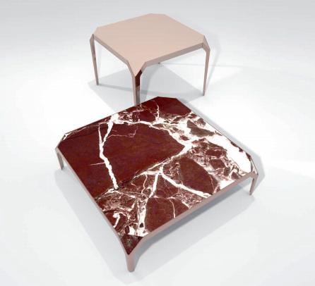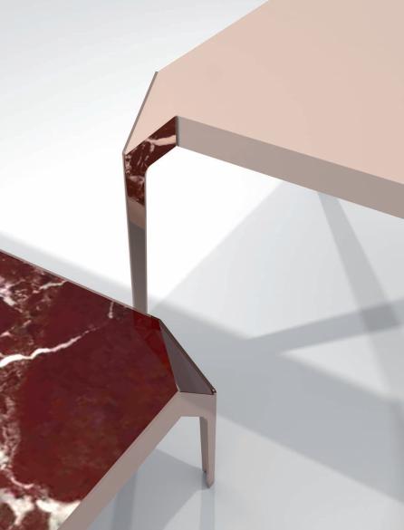 Small table in marble or lacquered wood with sloping angles framed by dove-tail leg profile in stainless steel.