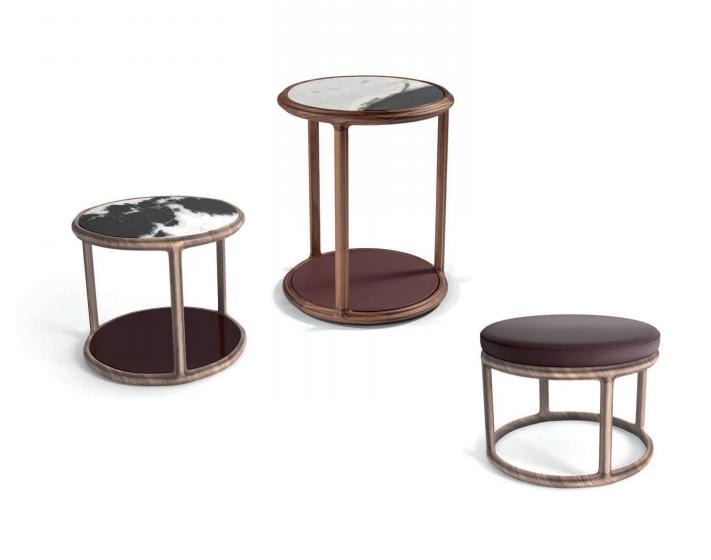 Low table, main structure in main structure in carved Canaletto walnut solid wood, lower shelf in shiny lacquered wood. Top in marble.