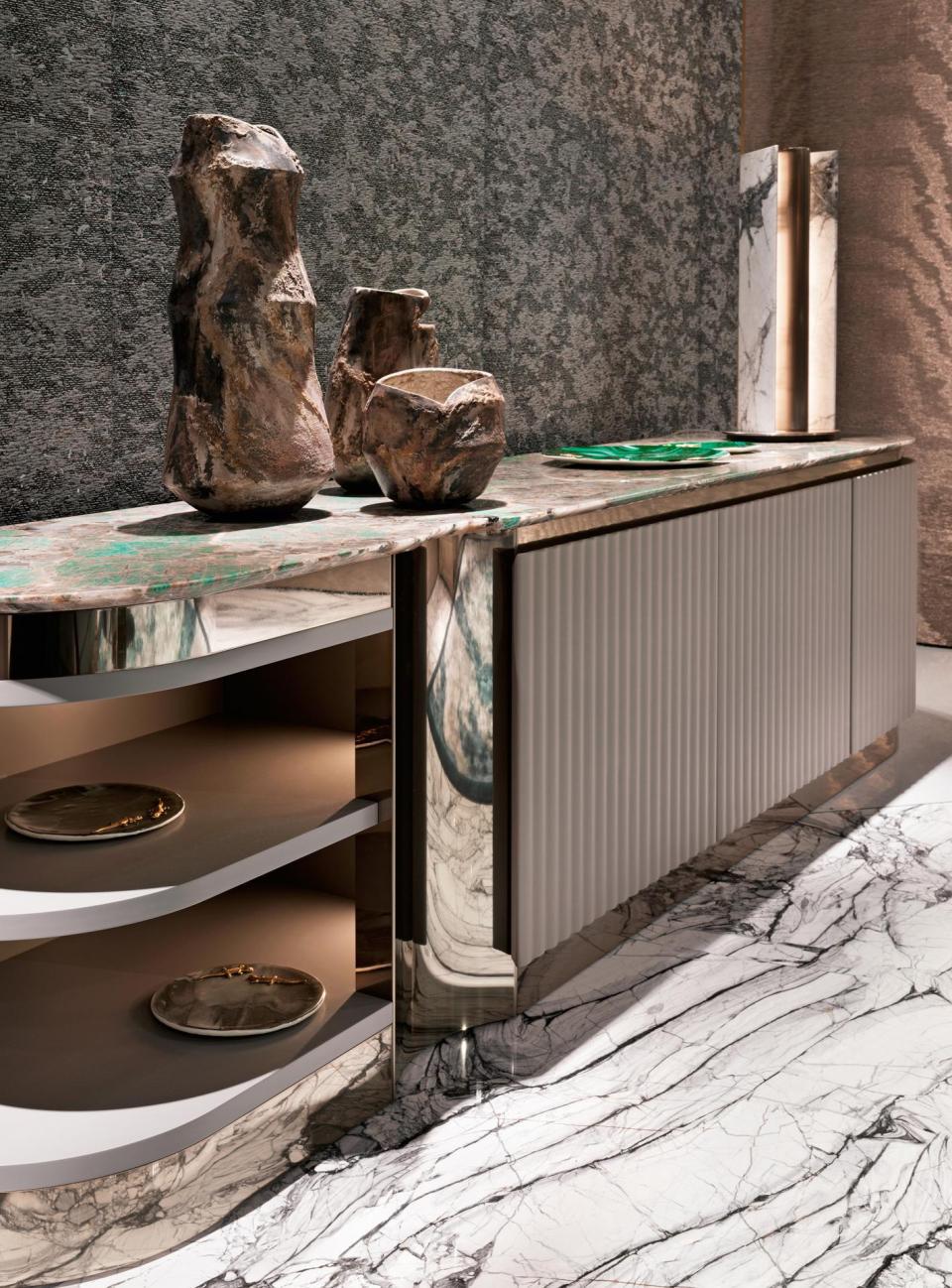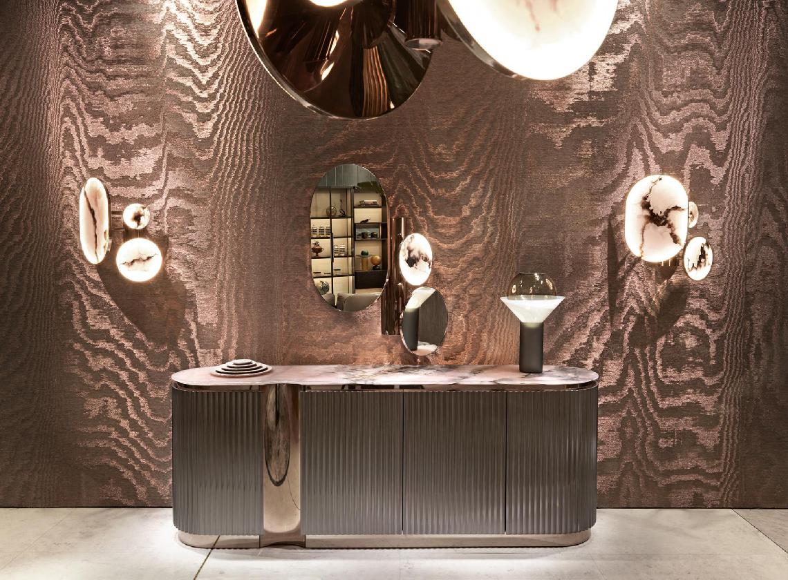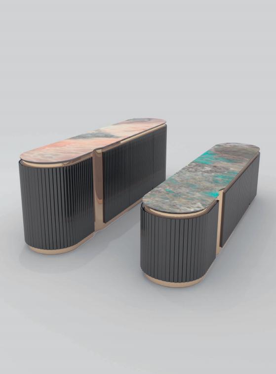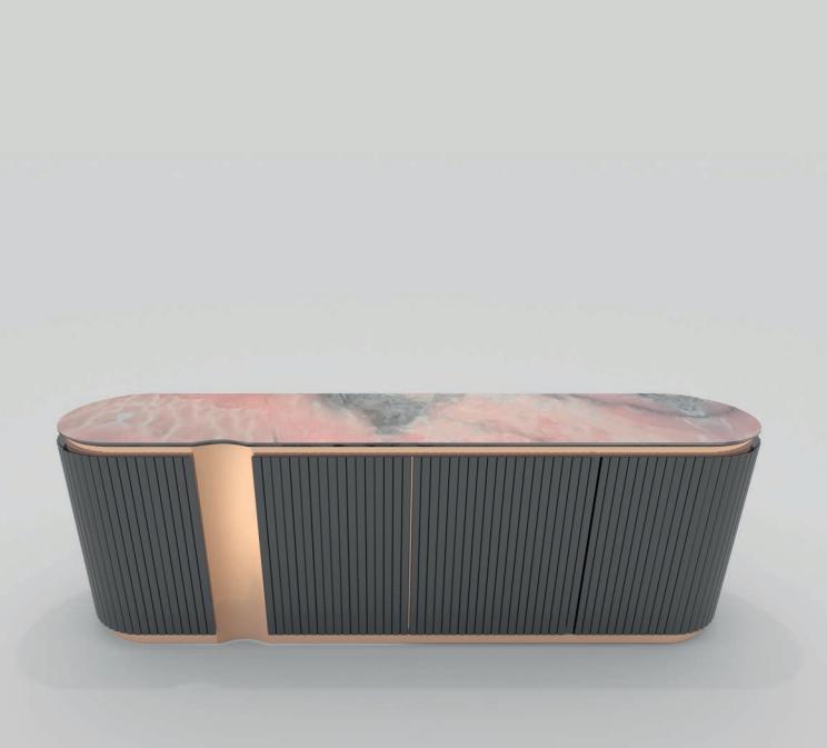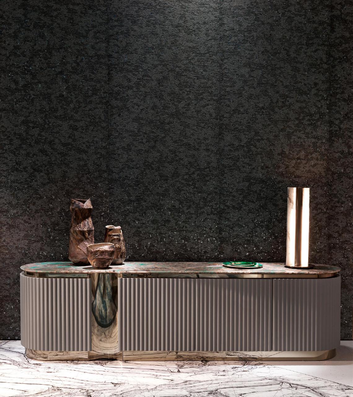 High unit with curved lateral sides; structure in wood with ribbed doors and sides, available either lacquered or upholstered in leather or fabric. Internal structure equipped with drawers lacquered in matt RAL colours. Base and decorative profiles in curved stainless steel. Marble top with bevelled profile.