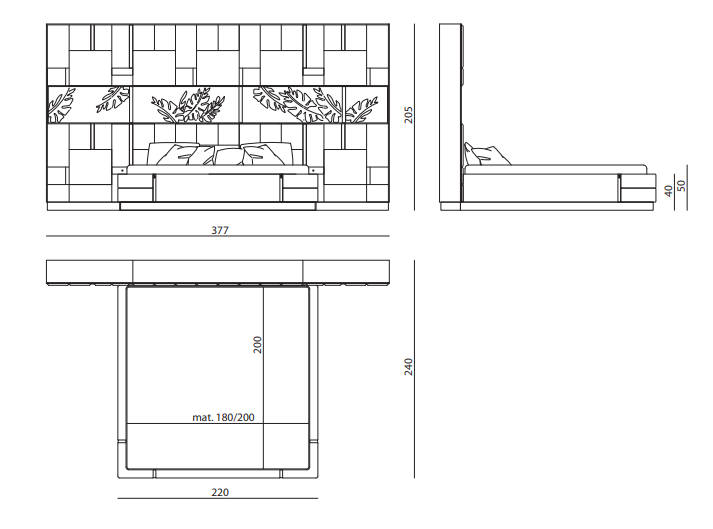 Bed upholstered in leather or fabric. Headboard upholstery decorated with geometric pattern, structure in plywood with upholstered panels, slightly padded one by one. Plinth and inserts in satinized stainless steel with engraved logo, storage niche with back covered with an artistic panel by Michele Astolfi, made in printed polycarbonate and decorated with glass inserts and Swarovski crystals. Courtesy LED lights. Bedframe in plywood consisting of several elements padded one by one with polyurethane foam and decorated with four inserts, bed base in satinized stainless steel.