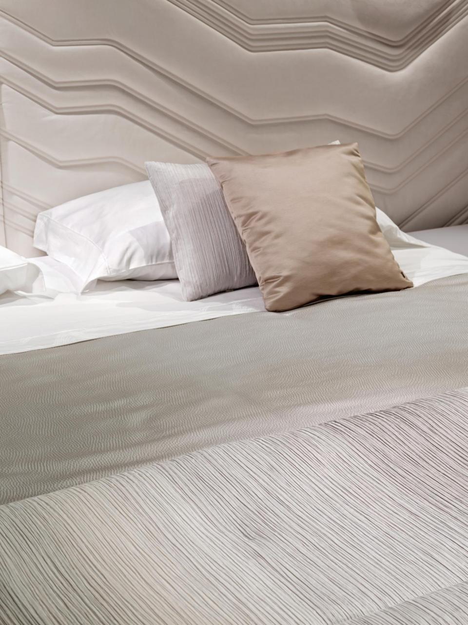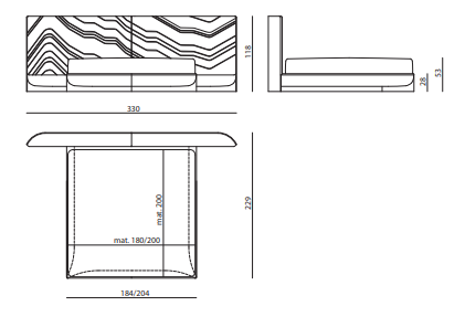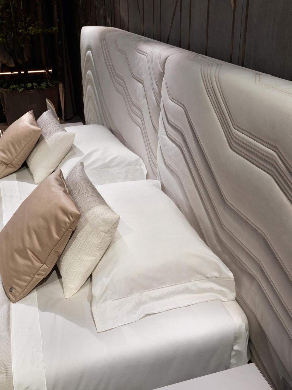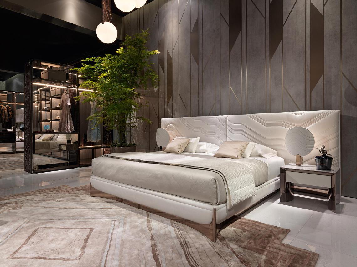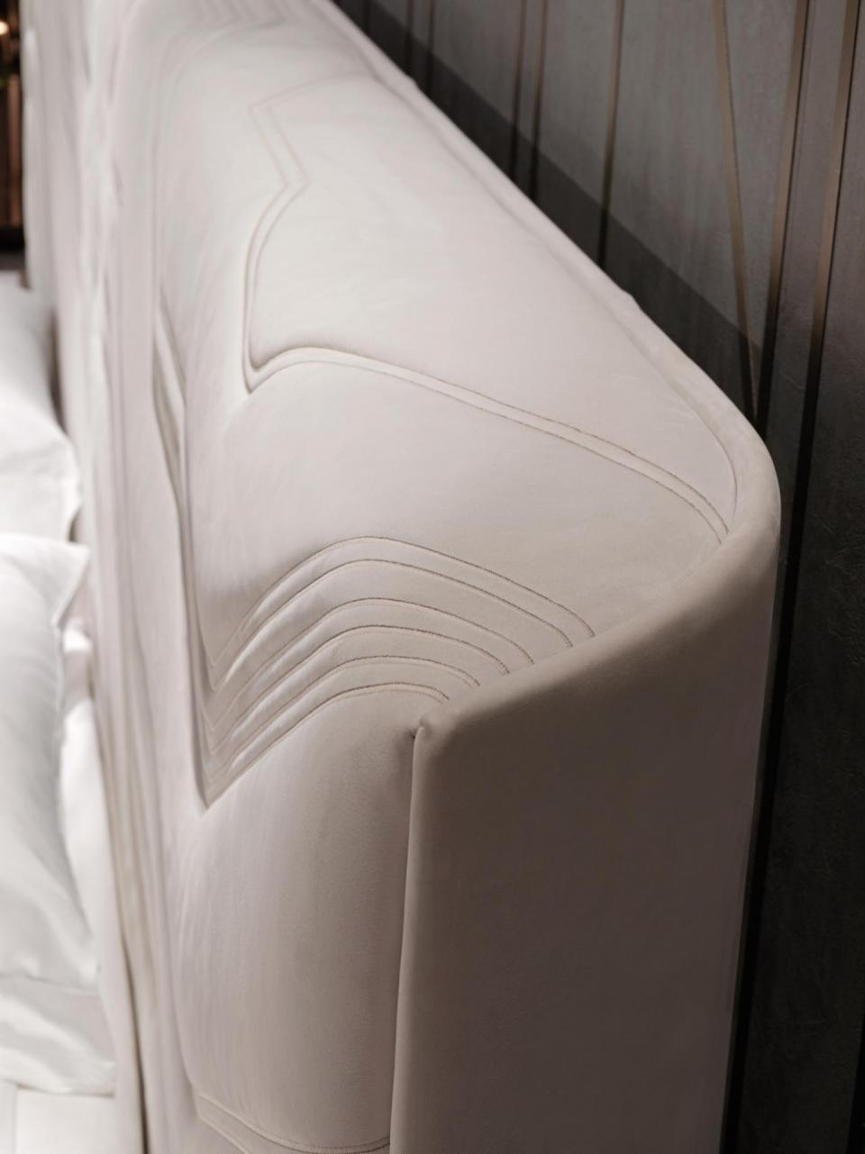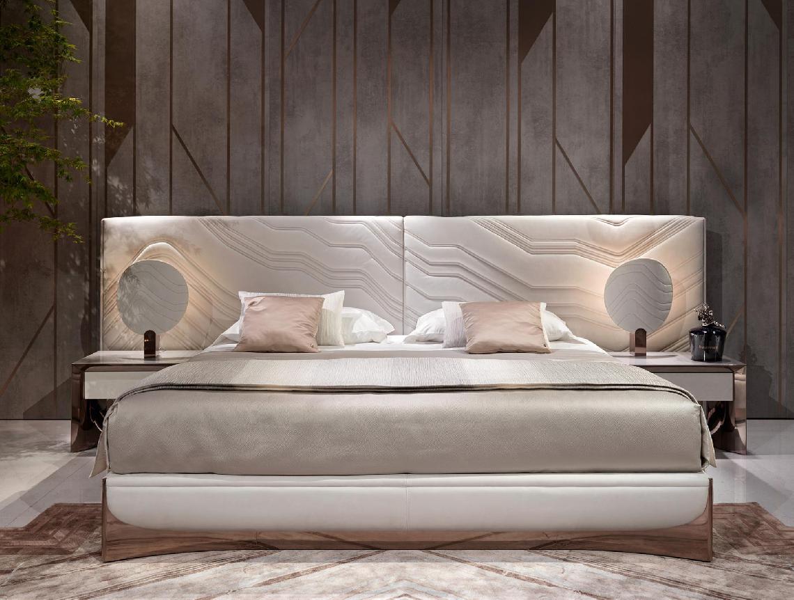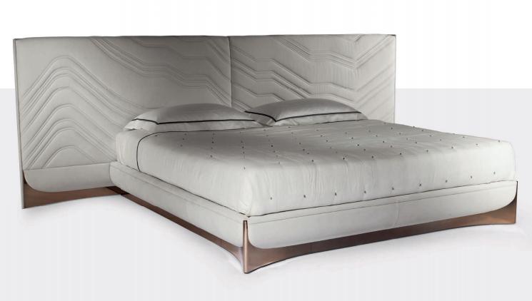 Bed with non-removable upholstery in leather or fabric with embroidered headboard decorated with quilted motif, shaped bed frame, structure in plywood and solid wood with integrated wooden slats; padding in multidensity polyurethane foam. Shaped base in wood coated in curved stainless steel with concave profile.