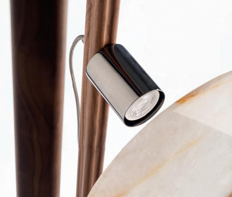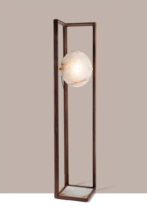 Floor lamp in Canaletto walnut solid wood with light diffuser in quartzite or onyx.