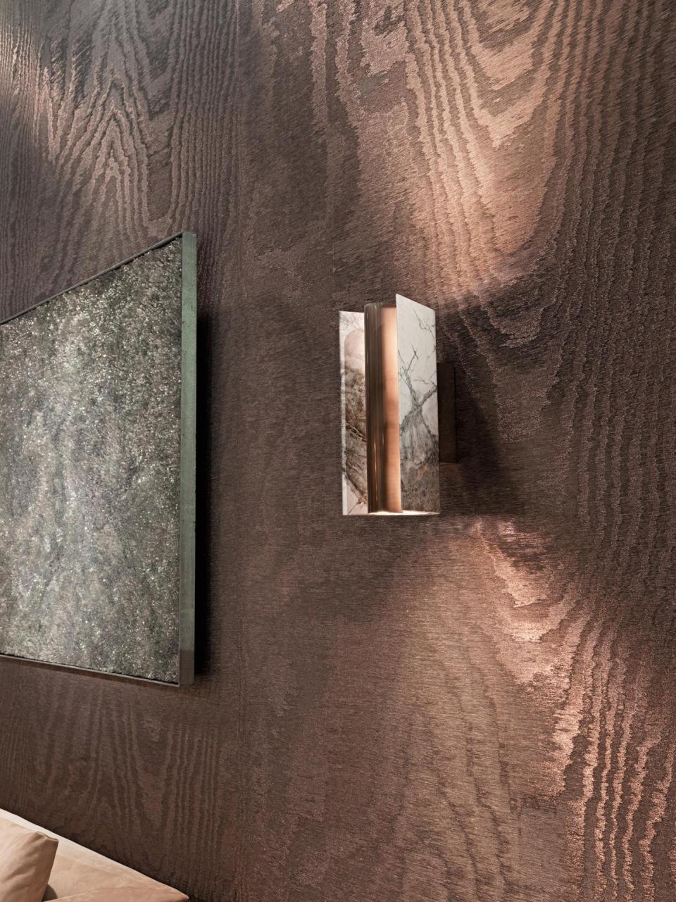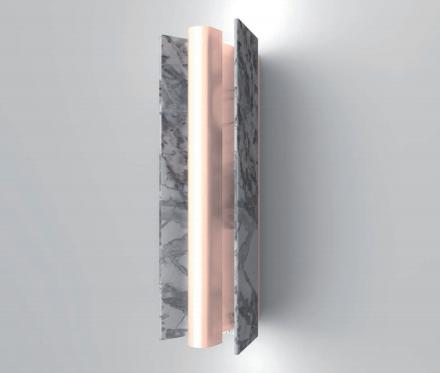 Table lamp and wall lamp carved from solid marble, light diffuser in stainless steel with LED diffuse lights.