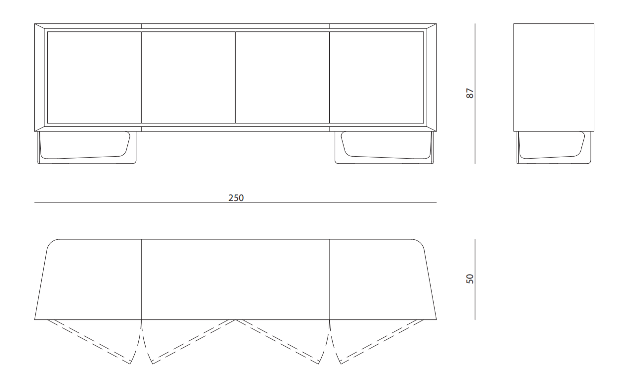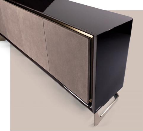 Lacquered structure in plywood with four doors and two internal drawers, grooves in satinized stainless steel. Doors externally upholstered in leather or fabric. Legs in satinized metal.