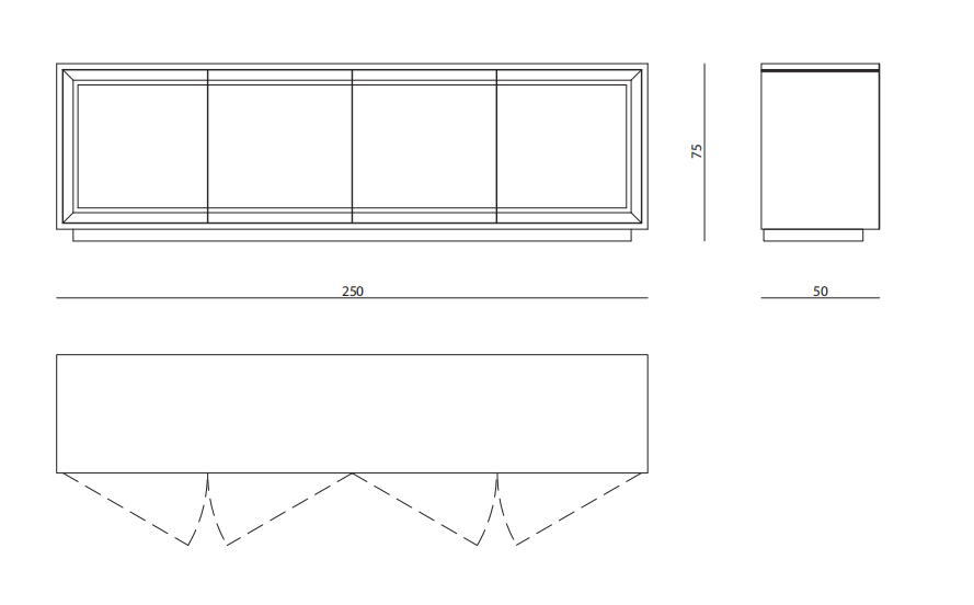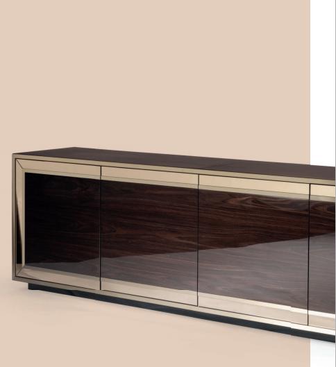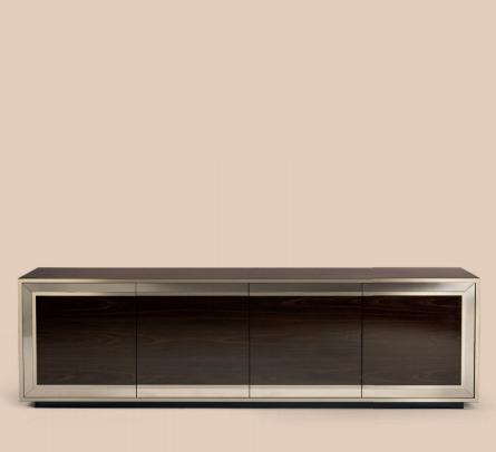 Cabinet with four push-pull doors with polished lacquered or veneered finish. Internal structure matt lacquered (in RAL colours), side and top upholstered in leather. Doors perimetral frame covered with mirror glass, frontal profiles in shiny stainless steel. Available also with four drawers.