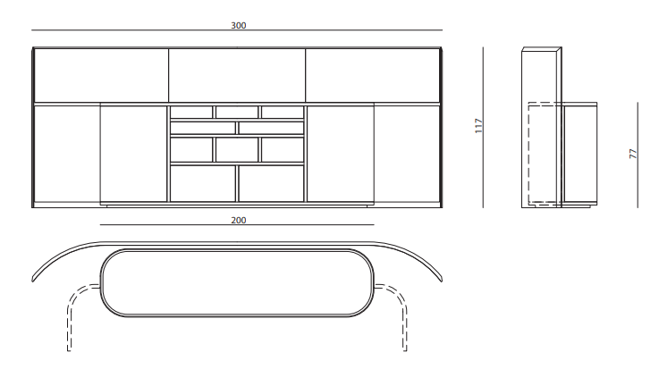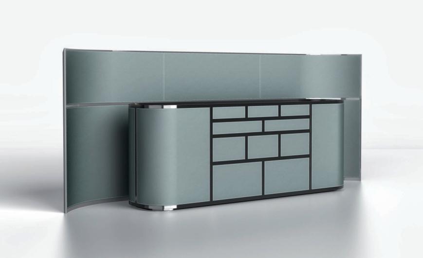 Storage cabinet in curved wood with lacquered edges decorated with hand-made 100 gloss finish. Internally upholstered in microfiber, external surfaces and front panels of drawers upholstered in leather with visible stitches. Equipped with internal LED lighting system.