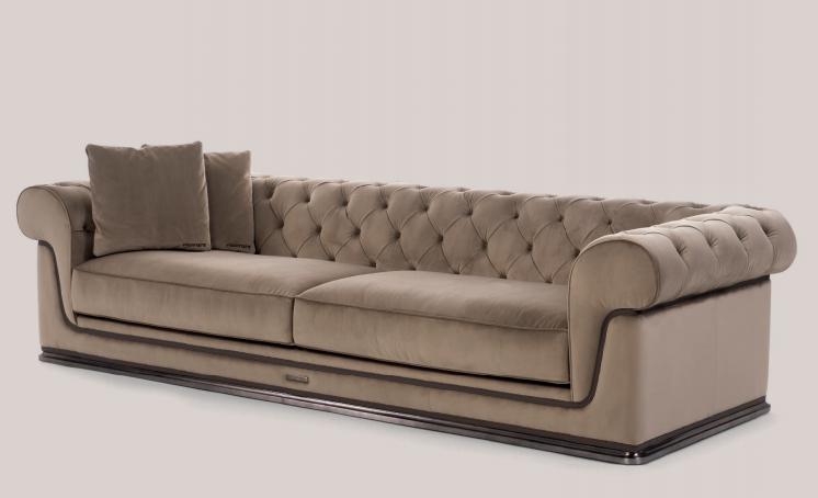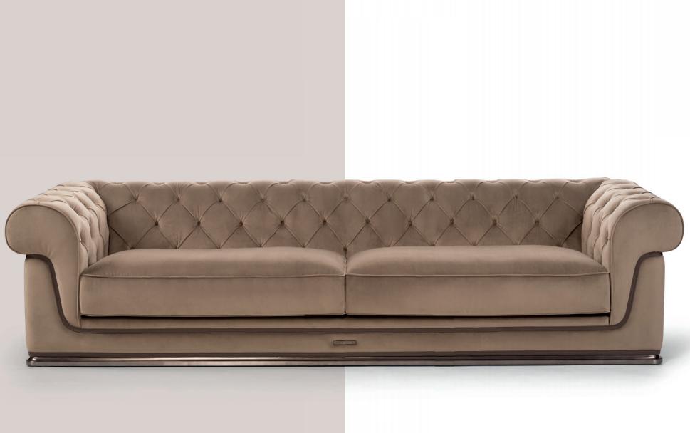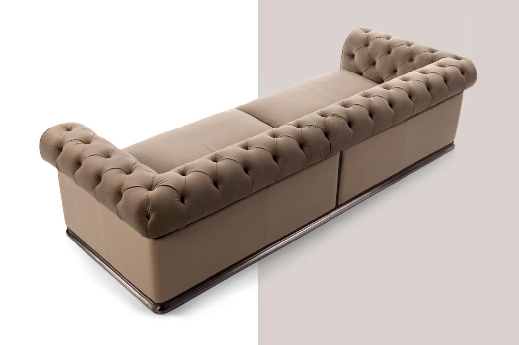 Sofa with non-removable upholstery in leather and fabric. Structure in plywood and solid wood, seat structure with elastic webbing stretch bands. Seat padding in multi-density polyurethane, Memory Foam? and feather, capitonné backrest. Finishing bands in leather and brass logo. Shaped plinth in satinized aluminium.