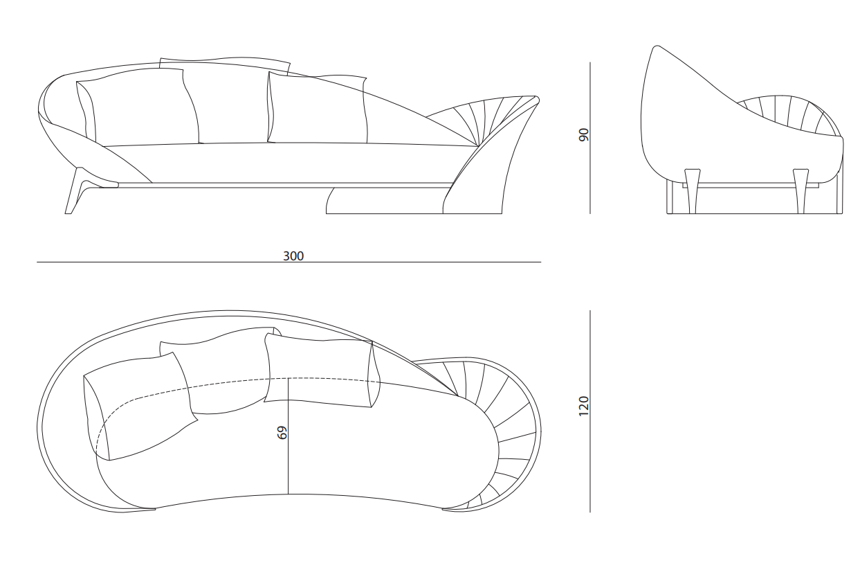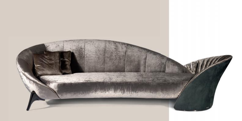 Asymmetric sofa with double upholstery. Frame in plywood  and solid wood with elastic webbing stretch bands, padded  with multi-density polyurethane foam, Memory Foam?  and feather. Backrest divided in two parts, decorated with  different quilted motifs. Supporting structure externally  upholstered in leather. Feet in polished lacquered wood.