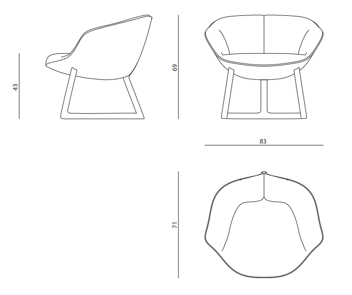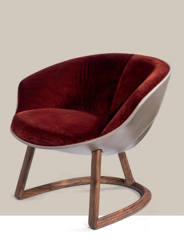 Small armchair with main structure in printed resin and padding in multi-density polyurethane foam, upholstered in leather or fabric. External structure upholstered in leather or lacquered. Curved base carved from Canaletto walnut solid wood, partly embedded the rear backrest.