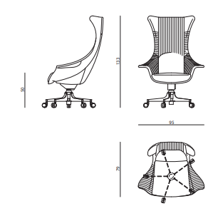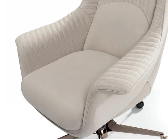 Main structure in plywood and solid wood, with elastic stretch bands on the seat. Seat and armrests padding in multi-density polyurethane foam. Upholstery in leather, armrests and backrest decorated with embroidered and perforated quilting. Curved external structure upholstered in leather. 5-wheels base in stainless steel with aluminium turnings. Rotating piston, adjustable in height, with damping and tilt lock mechanisms.