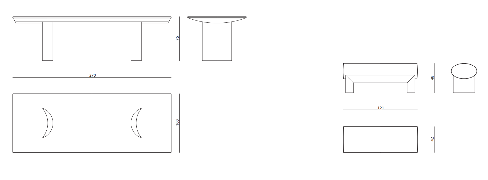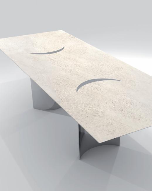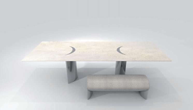 Outdoor dining table, main structure in shiny 316 stainless steel with curved under-top and column legs with concave and convex surfaces. Top in granite or concrete slab coated with decorative paste giving a metallic-like texture. Crescentshaped top with decorative friezes in stainless steel.