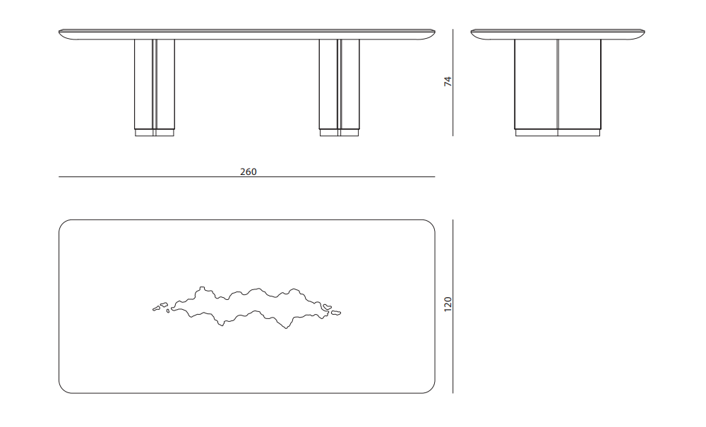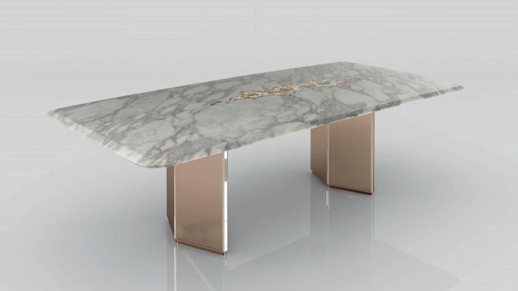 Rectangular dining table with top in marble decorated with hand-made artistic insert in resin, plaster and pigments. Bevel edge counter top. Bevelled under-top in polished lacquered wood. Base consisting of two legs in boxed stainless steel with rhombus section.