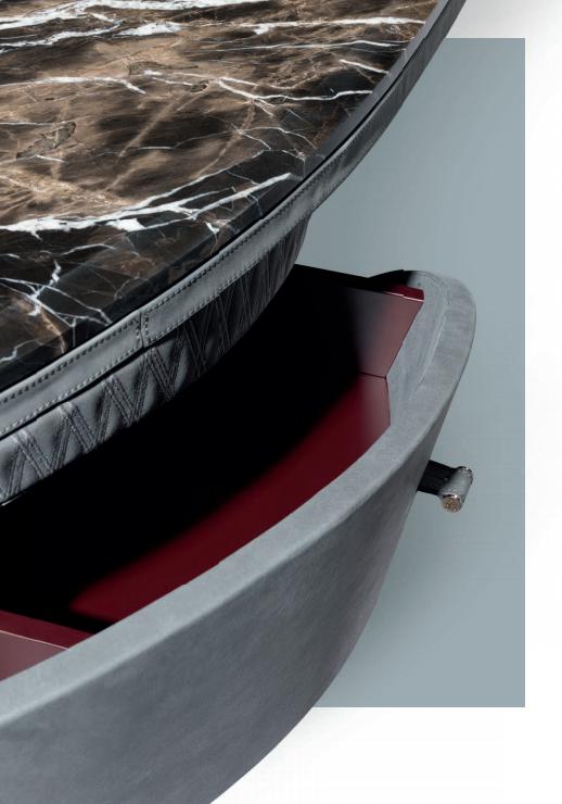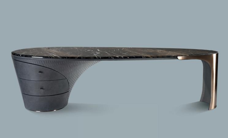 Desk with leather upholstery and marble top. Main structure in shaped wood, internally upholstered in leather, alternating plain and lozenge-quilted upholstery; equipped with two drawers with handles in leather and brass, and cable guide. Leg in curved wood, internally upholstered in leather and externally coated in curved satinized stainless steel. Oval top in bevelled and polished marble, with cable guide.
