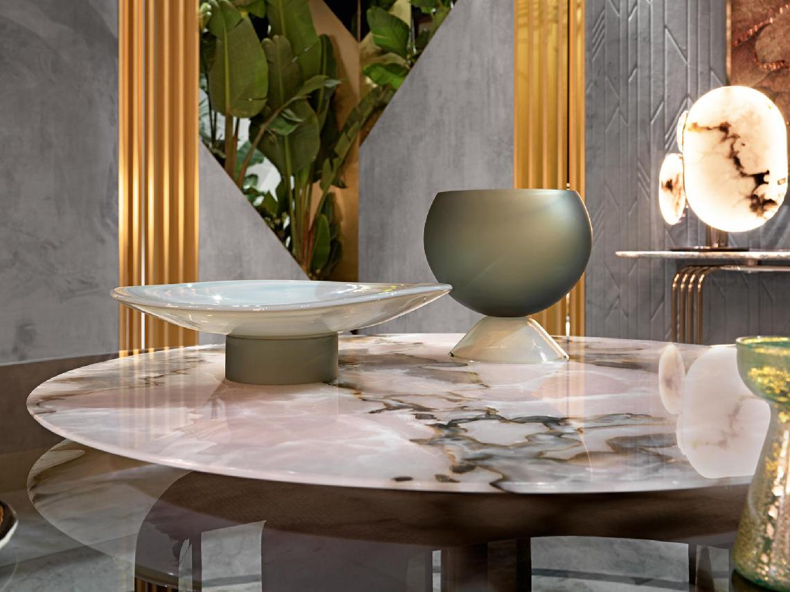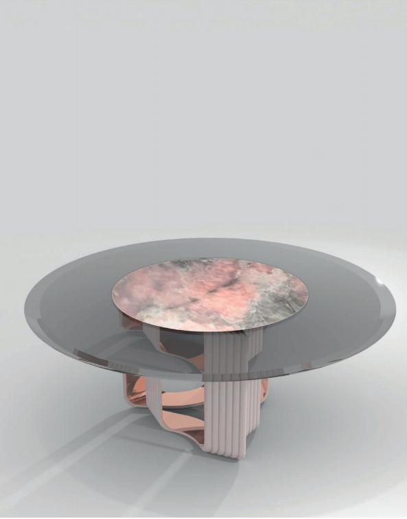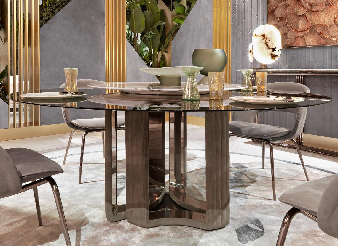 Round glass dining table with Lazy Susan in marble. Metal legs with quilted upholstery in leather or fabric, internally coated in stainless steel.