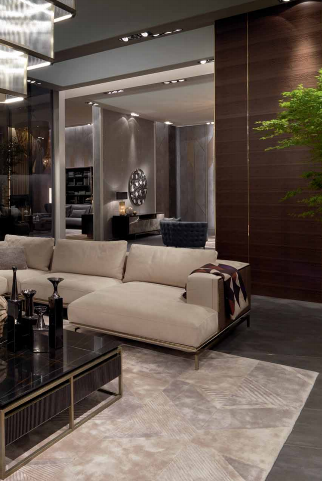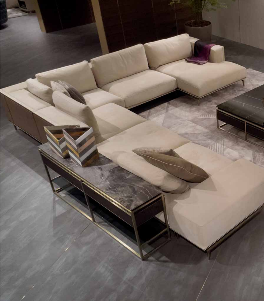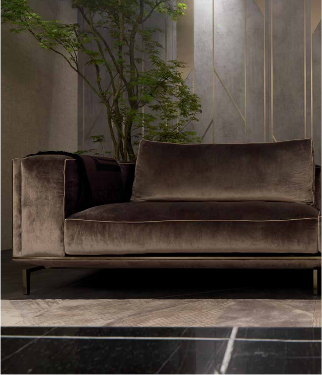 Sofa upholstered in leather or fabric, with base composed of a frame in satinized stainless steel and a panel in wood and metal covered in leather or fabric, equipped with elastic belts for the seats suspension. Armrests and backrests made of a wooden panel edged by a brass profifile th.10x10 mm, and upholstered with leather, fabric or woven leather padded on the inside. Seat cushions in polyurethane with different densities, memory foam? and feather. Back and armrest cushions in polyurethane and feather, loose cushions in feather. Metal parts available in the satinized metal fifinishing selection. Modular sofa available with central elements without backrest that can be combined with the Banner console.