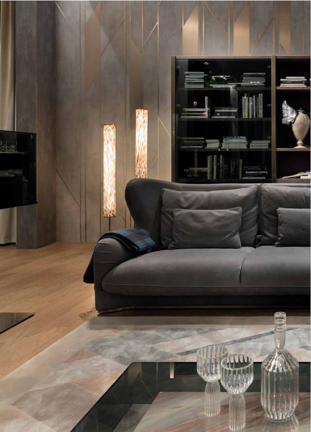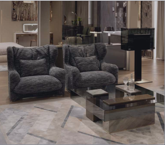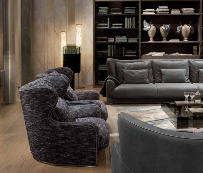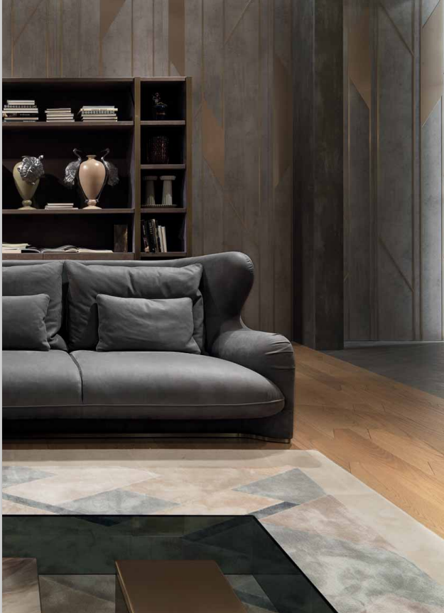 Internal structure in solid wood and plywood with elastic suspension. Suspended shell and upholstered seat cushions with fifixed cover, upholster in leather or fabric. High back and bergère sides. Padding in different density polyurethane, memory foam? and feather. Back cushions and down cushions in feather. Base covered in satin stainless steel. Also available pouffe with internal structure in solid wood and plywood, padded in polyurethane with different densities. Upholstery in leather or fabric. Metal parts available in the satinized metal fifinishing selection.