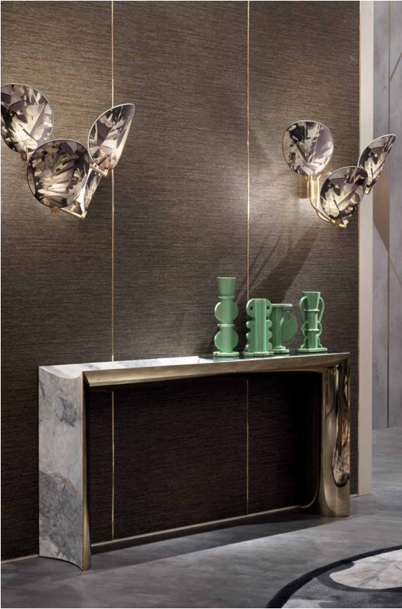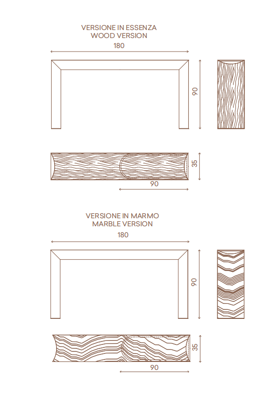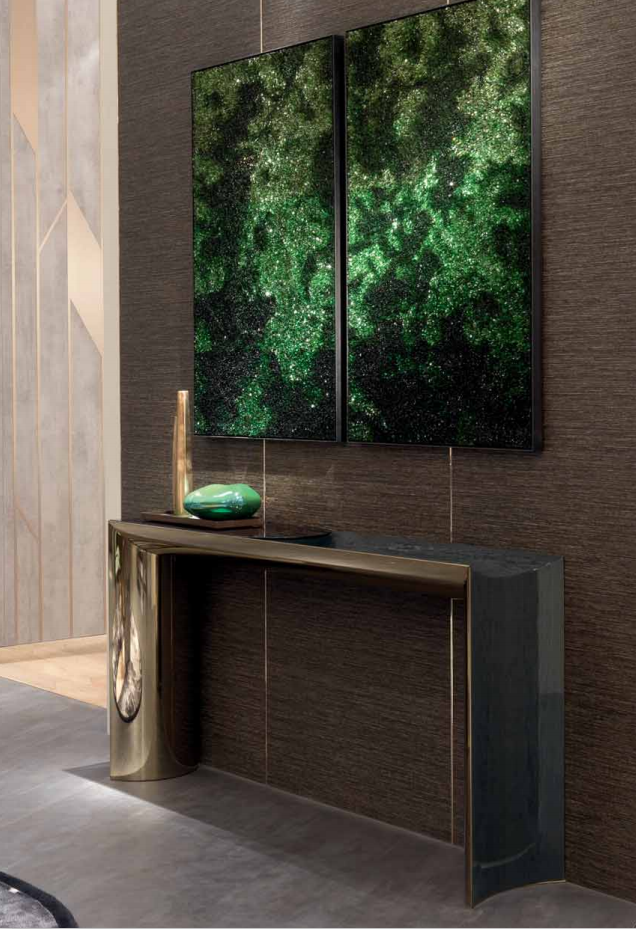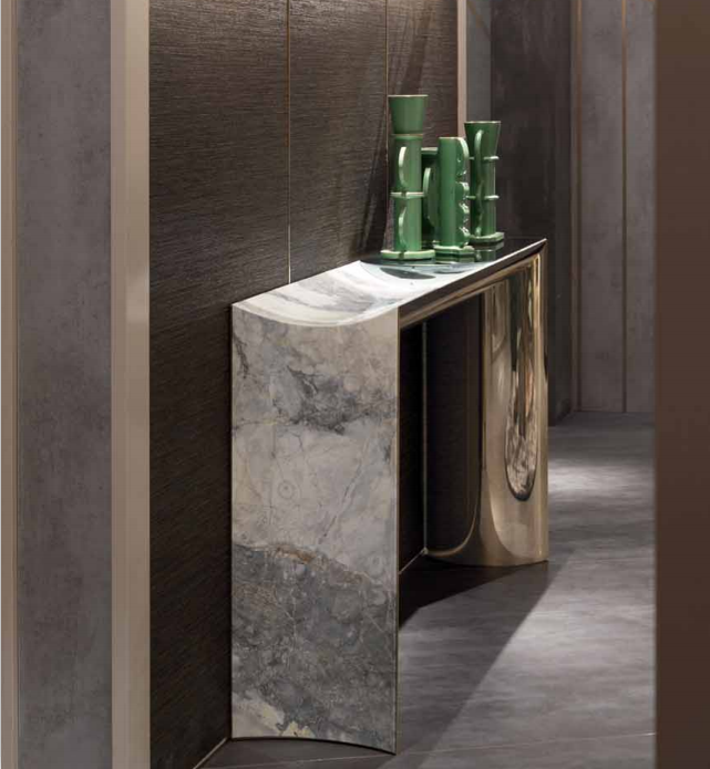 Console in wood with polished veneered concave legs and top, the inside part is covered in curved polished stainless steel. Second partial top in smoked crystal. Metal parts available in the metal fifinishing selection, wooden parts available in the veneer selection fifinishings. Console in solid marble with concave work for top and legs, handmade polished. The inside part is covered in curved polished stainless steel. Second partial top in smoked crystal. Metal parts available in the metal fifinishing selection, wooden parts available in the veneer selection fifinishings.
