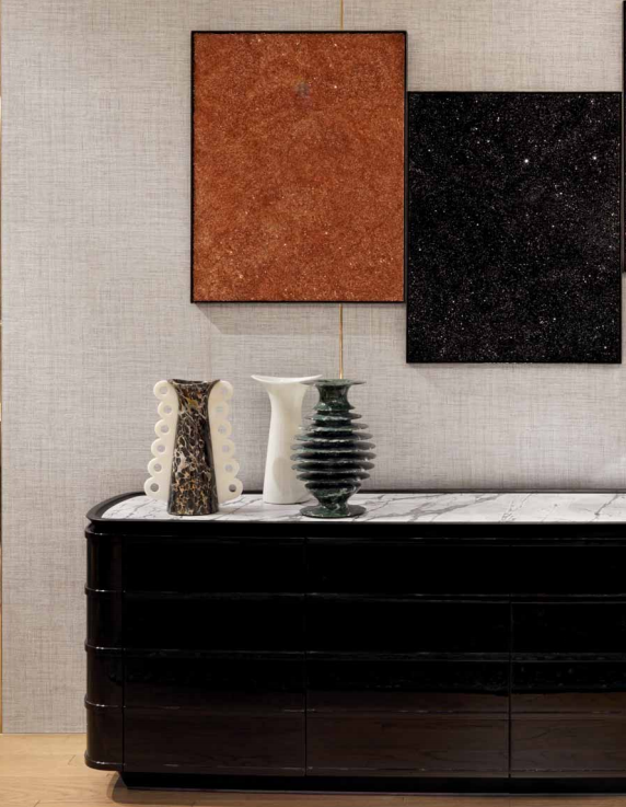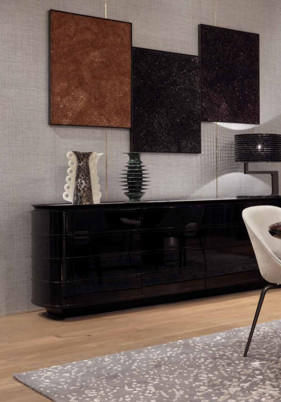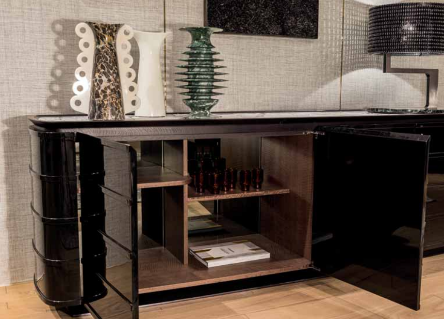 Cabinet with 4 doors, semi-elliptical central body in curved wood on all sides, external surface with raised profifiles, glossy lacquered fifinish. Marble top inserted in a molded frame in solid Oak wood with black open-pore fifinish. Conical base in black wood and lower profifile in satin metal. Interiors with shelves and drawers, fifinished in eucalyptus root with open pore fifinish and smoked mirror backs. Drawers covered in leather with microfifibre lining. Available with internal LED lighting. Also available in the "Wall" version with flat back