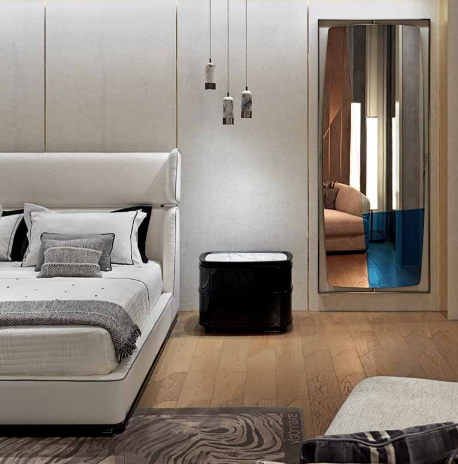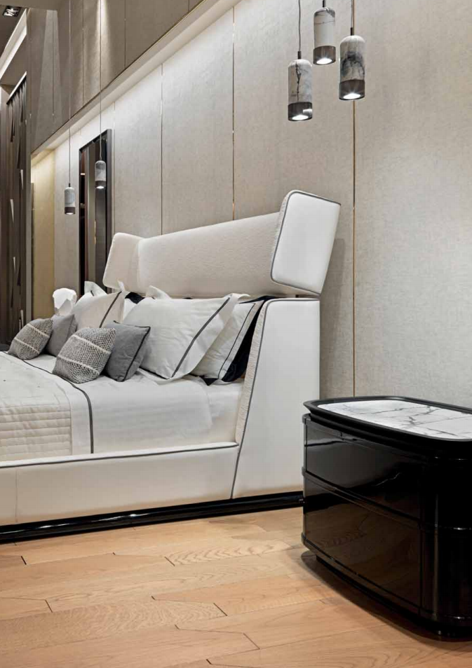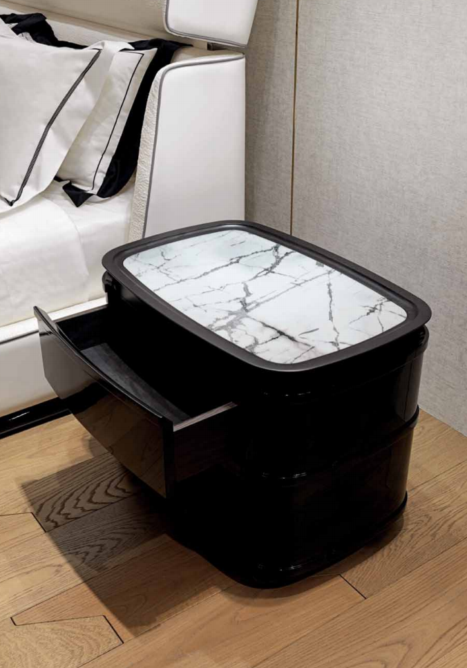 Bedside table with 2 drawers with semi-elliptical central body in curved wood on all sides, external surface with raised profifiles, glossy lacquered fifinish or covered in leather. Marble top inserted in a molded frame in solid Oak wood with black open-pore fifinish. Conical base in black wood and lower profifile in satin metal. Drawers interiors in black oak and black microfifibre inside.