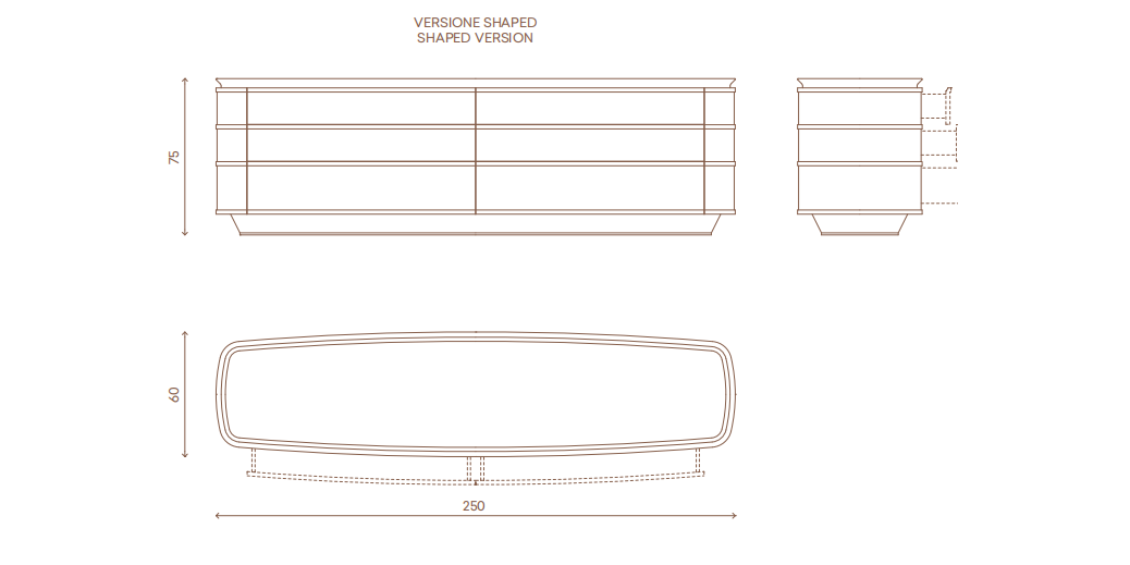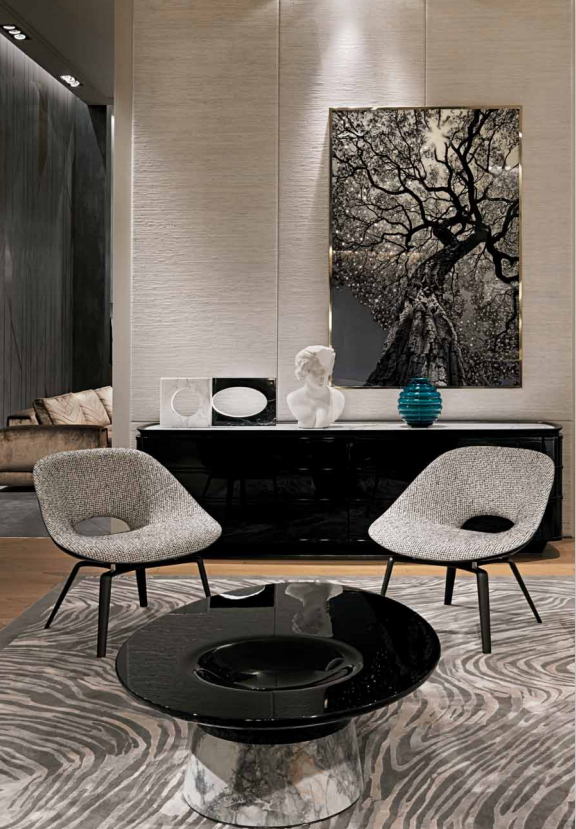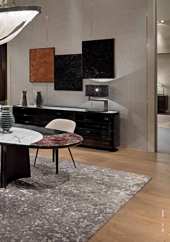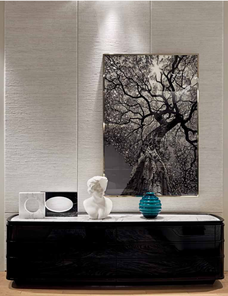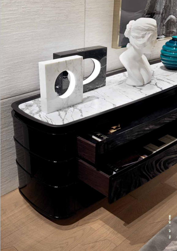 Chest of drawers with 6 drawers with semi-elliptical central body in curved wood on all sides, external surface with raised profifiles, glossy lacquered fifinish. Marble top inserted in a molded frame in solid Oak wood with black open-pore fifinish. Conical base in black wood and lower profifile in satin metal. Drawers interiors in black oak and black microfifibre inside. Also available in the "Wall" version with flat back.