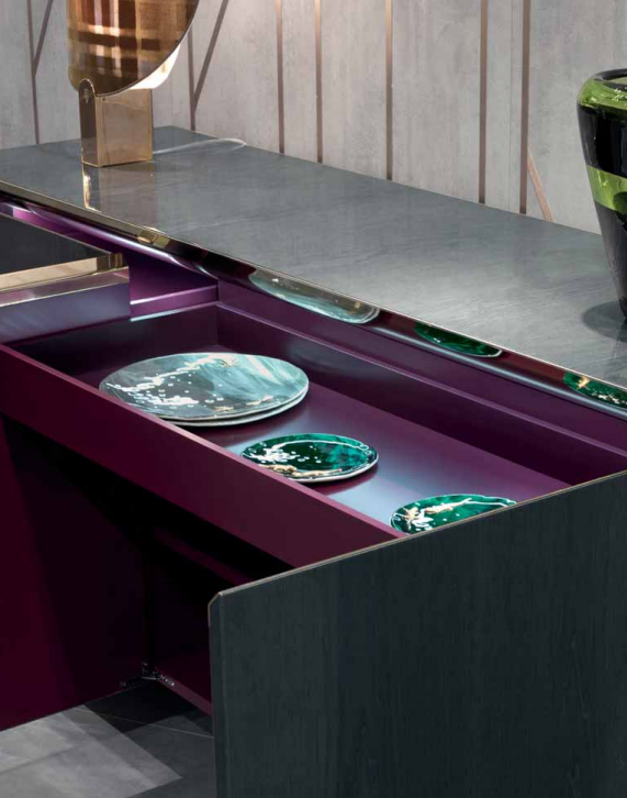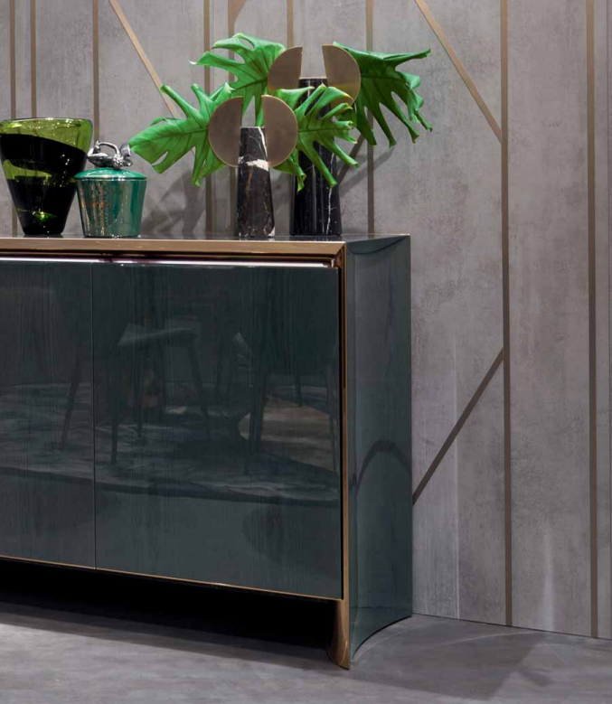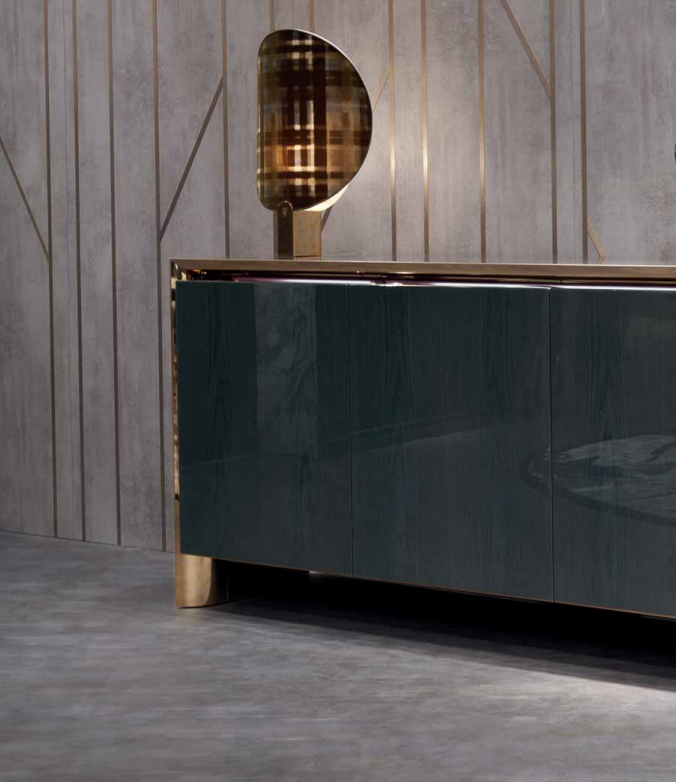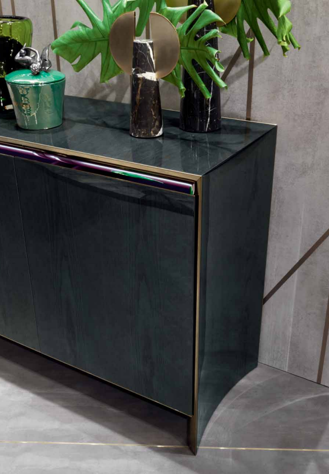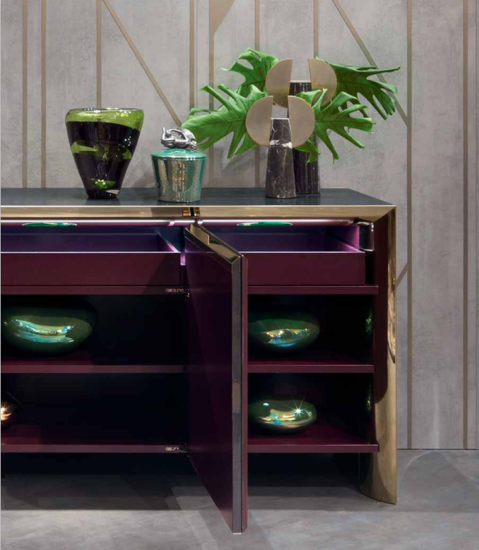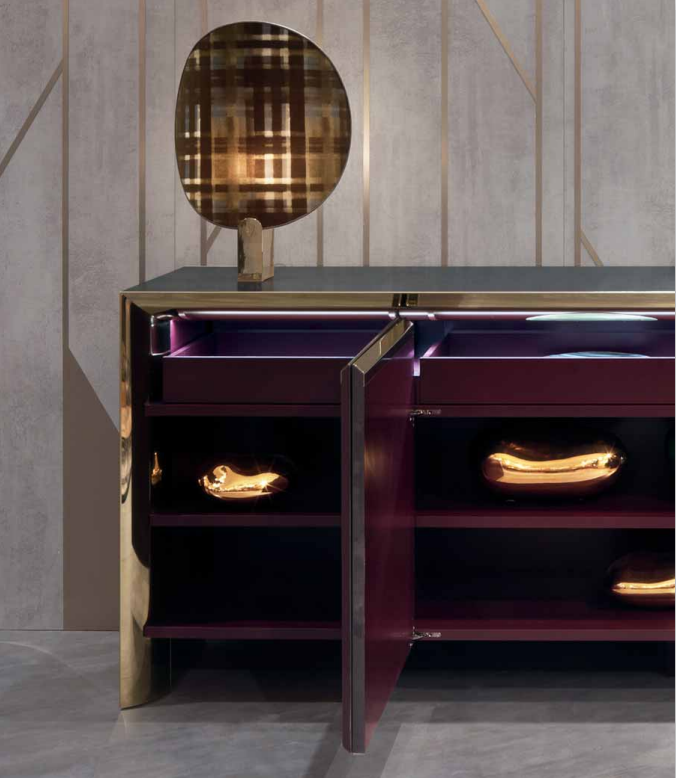 Cabinet with four doors, wooden frame with concave sides, veneered top  and doors with 100 gloss handmade fifinishing. Internal frame of sides and top  in polished stainless steel bent inwards. Interiors laquered in RAL colour with  a matte fifinish, with visible internal drawers even with closed doors. Available  with inside LED light under the top. Metal parts available in the metal  fifinishing selection, wooden parts available in the veneer selection fifinishings