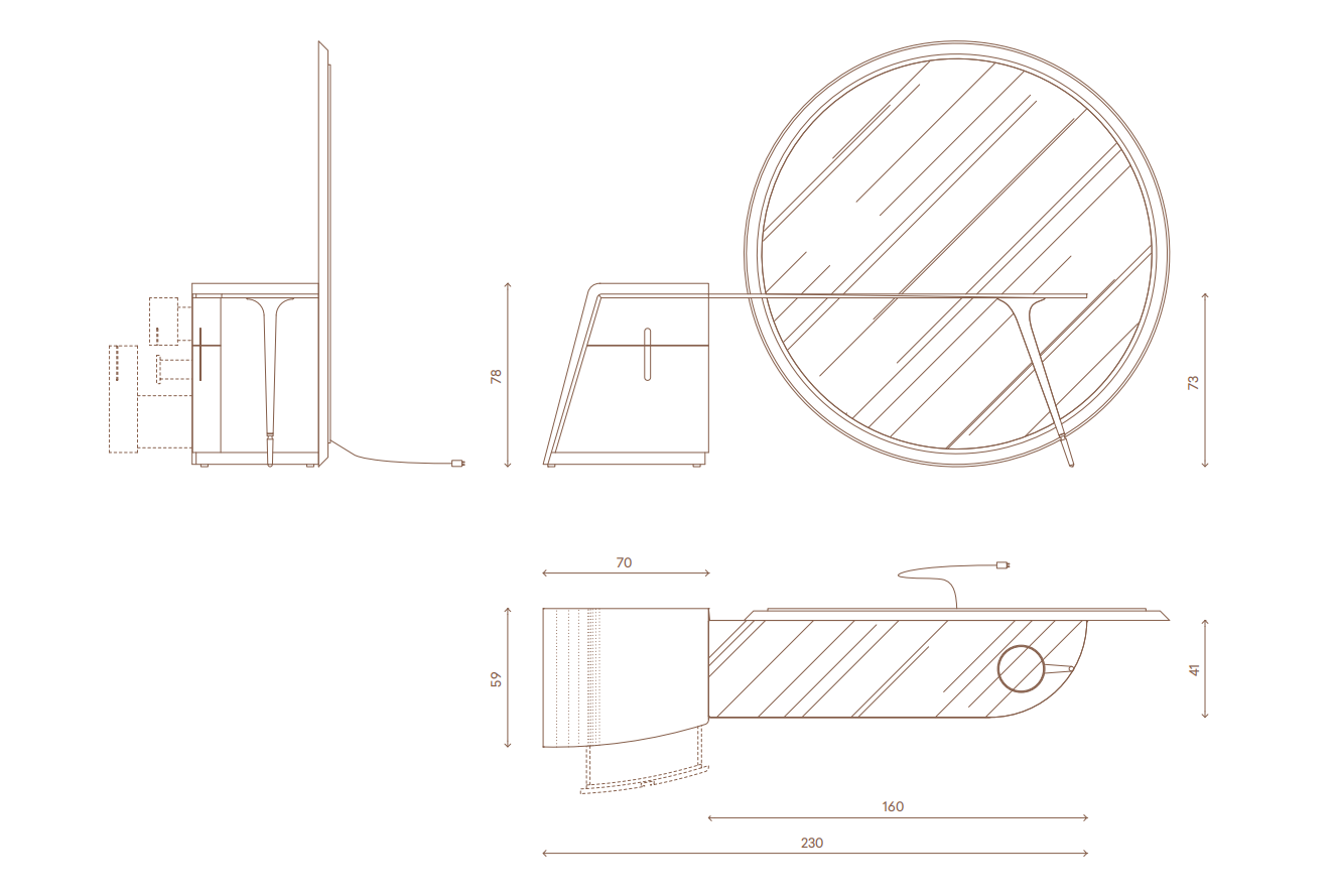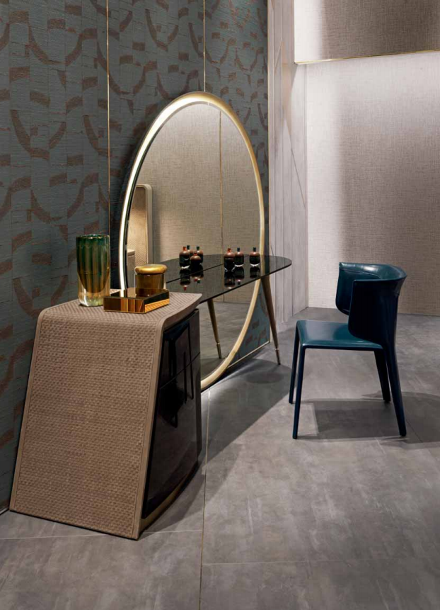 Vanity unit with drawer unit and top in crystal 16 mm. Structure in plywood and MDF with front drawers covered in veneer and lacquered internal parts (RAL colours). Top and external side of the drawer unit covered with woven leather with smooth edges. Plinth and drawers borders in satinzed stainless steel. Top in tempered glass (extra clear/bronze/smoked), wooden leg covered in leather with tips in satinized stainless steel. The available fifinishes for the front drawers and the internal side are included in the veneer selection fifinishings. Metal parts available in the satinized metal fifinishing selection. In combination with WESTLEY mirror with lighting