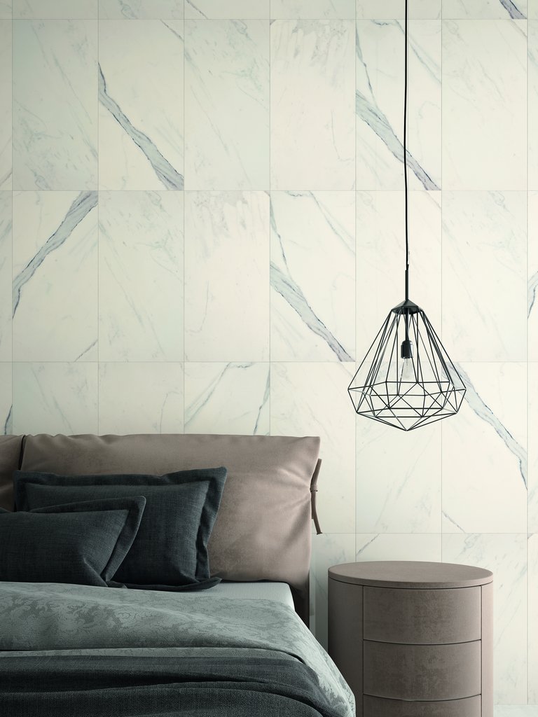 Calacata is a marble-effect porcelain tile offered with a Polished Fully Lappato finish.