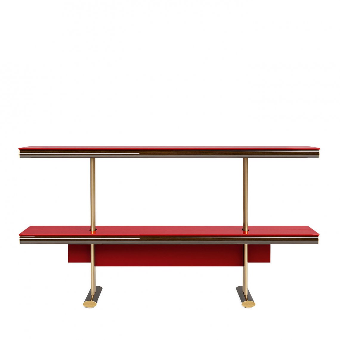 features two long shelves of red-