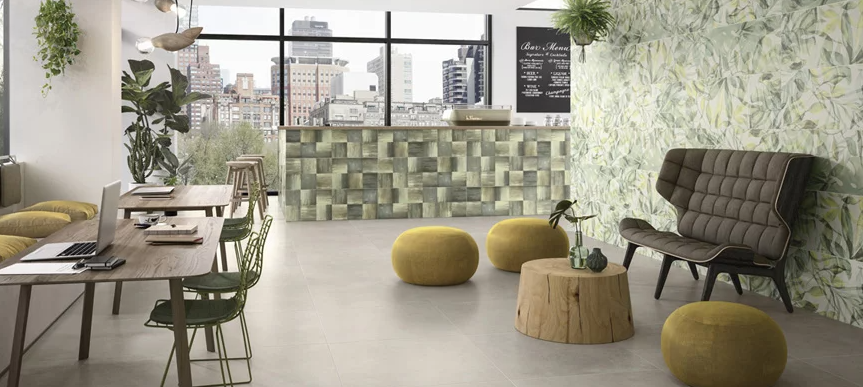 An urban concrete look in gentle natural tones, animated by inclusions reminiscent of hand-crafted terrazzo plus a sophisticated décor featuring lush, exotic plants and shimmering ceramics in calm shades of green – the high-quality URBAN JUNGLE design concept combines current design themes and interprets them in a new and distinct vein.