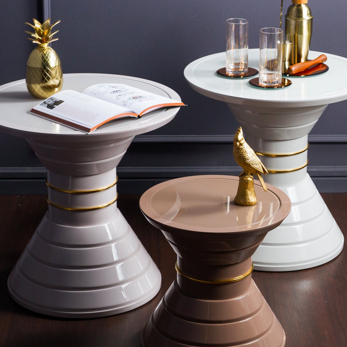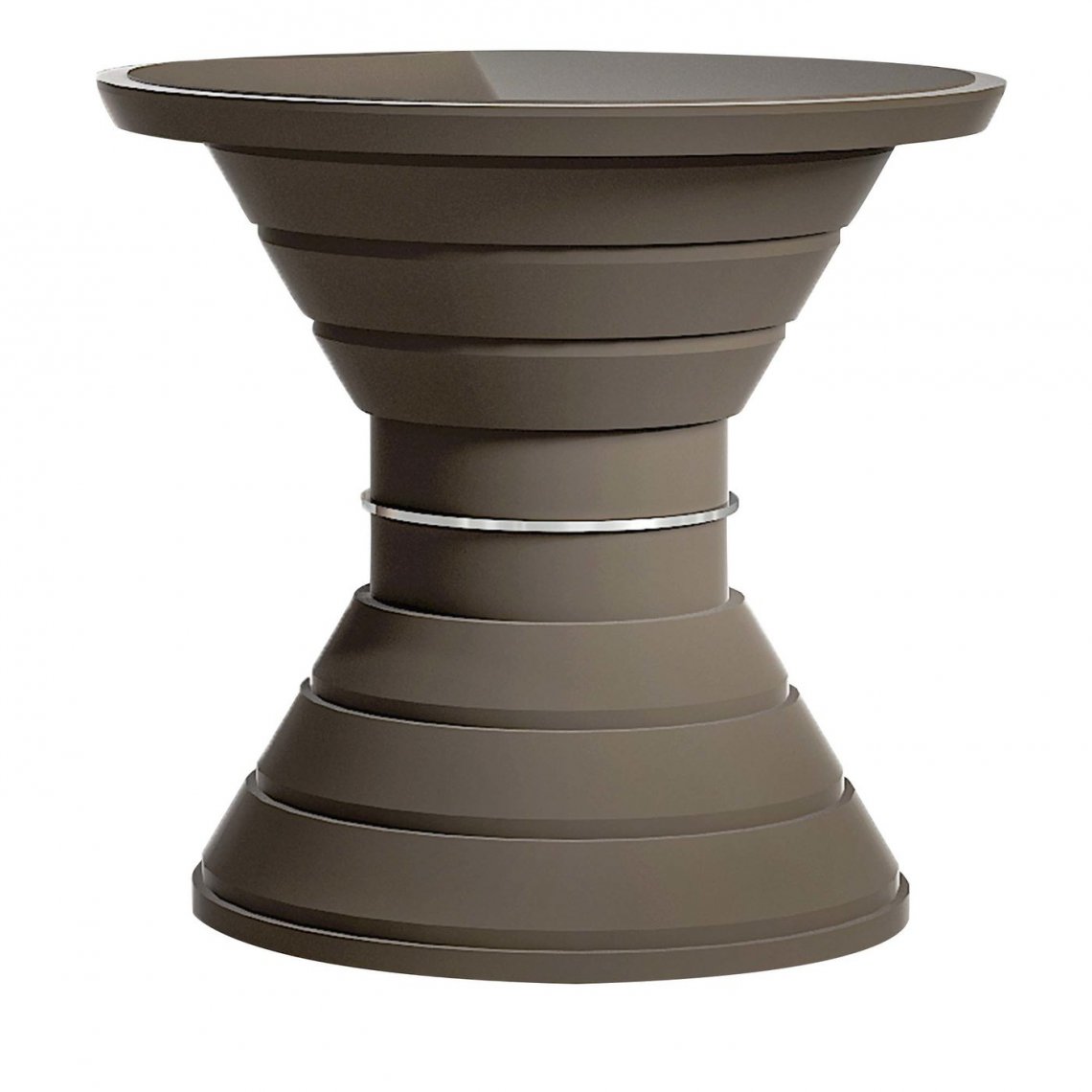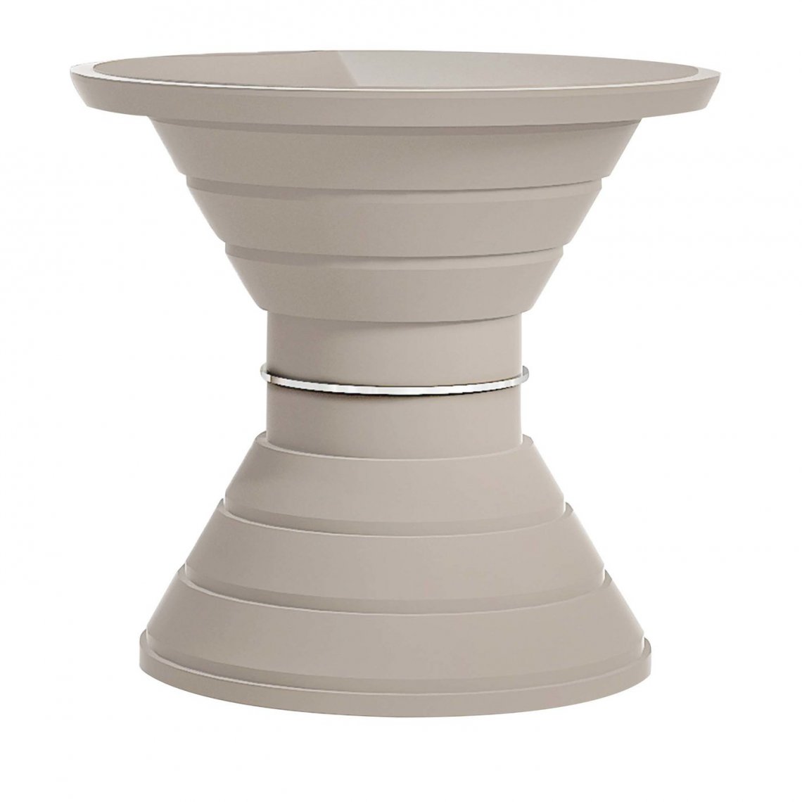 It is about a new vision of modern interior which is marked with an individual style and aesthetic taste but also with a timeless elegance. This side table, with tempered built-in glass on the wooden top, has a structure composed by different diameter rings lacqueerd in soft touch tortora, and a decorative ring in gold plated polished steel.