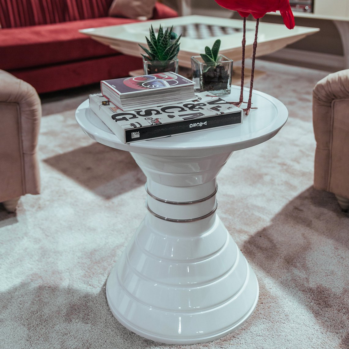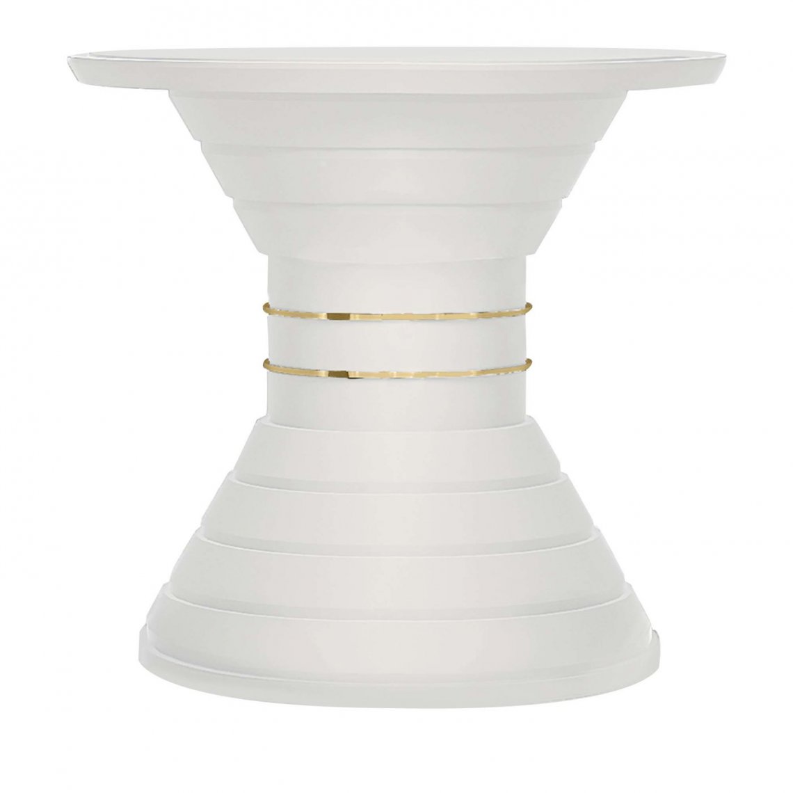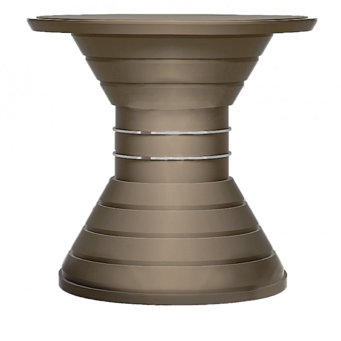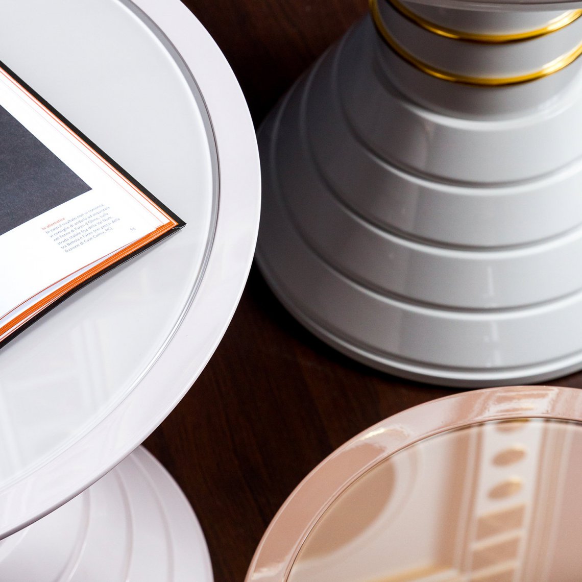 It is about a new vision of modern interior which is marked with an individual style and aesthetic taste but also with a timeless elegance. This side table, with tempered built-in glass on the wooden top, has a structure composed by different diameter rings lacqueerd in soft touch tortora, and a decorative ring in gold plated polished steel.