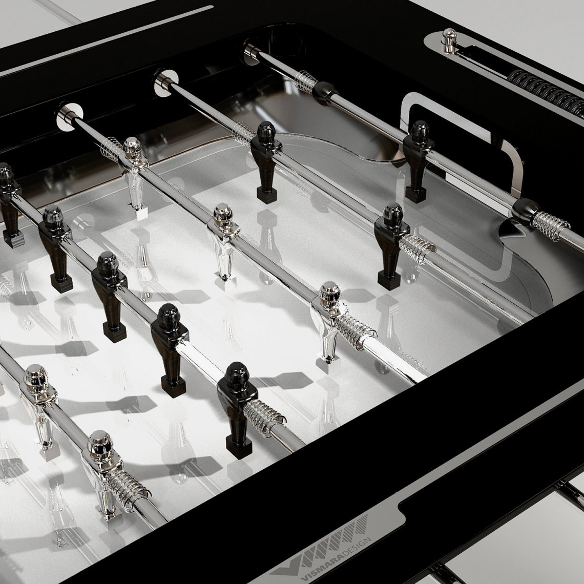 Stadium Foosball Table is a common product transformed into a refined example of top Italian design and quality. The playing field has an extra light lacquered white tempered glass with lacquered pearl grey sloped edges. Players are made of precision turning aluminum while rotating bars are in chromed steel. The structure is in lacquered glossy black wood.