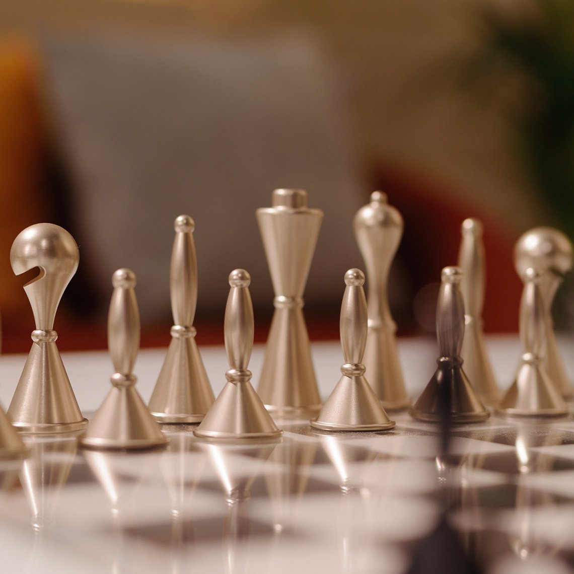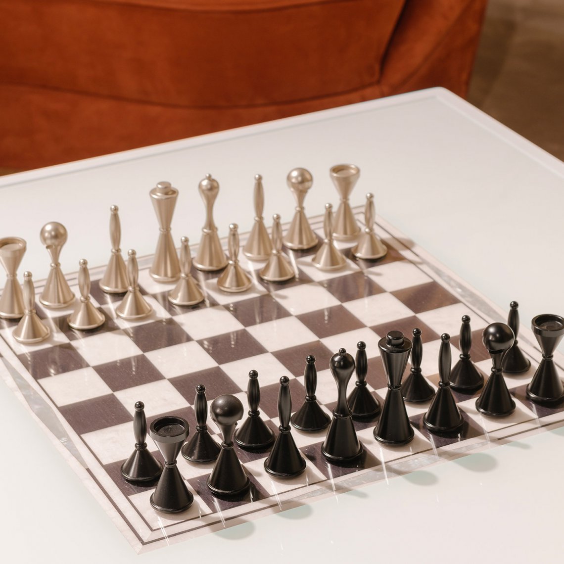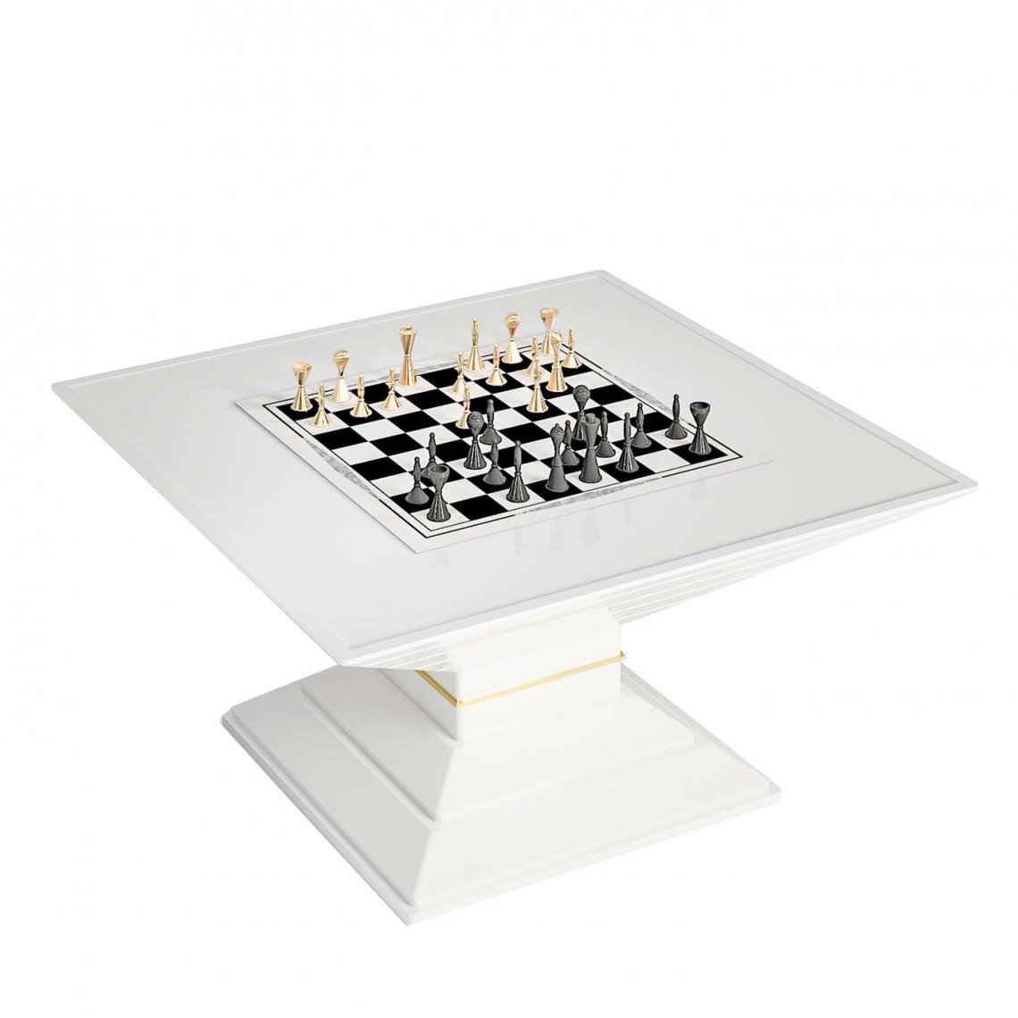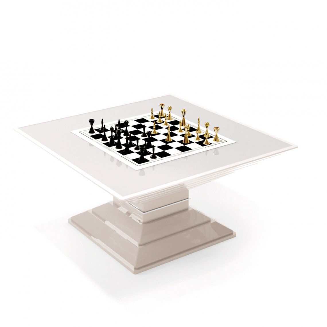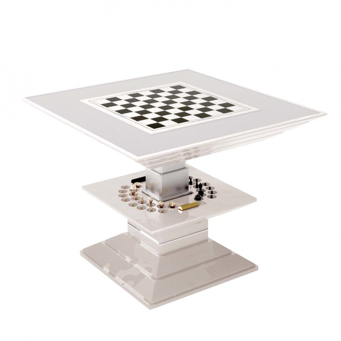 A multifunctional squared game and coffee table, with lift mechanism powered by lithium battery rechargeable from electrical outlet. Top made of built-in lacquered glossy lilac grey tempered glass with inlaid chessboard in Ebony, Erable wood and mother-of-pearl. Chess and checkers pieces included. Complete of wooden backgammon cup with 5 dices. Inside compartments with built-in space to store game set.