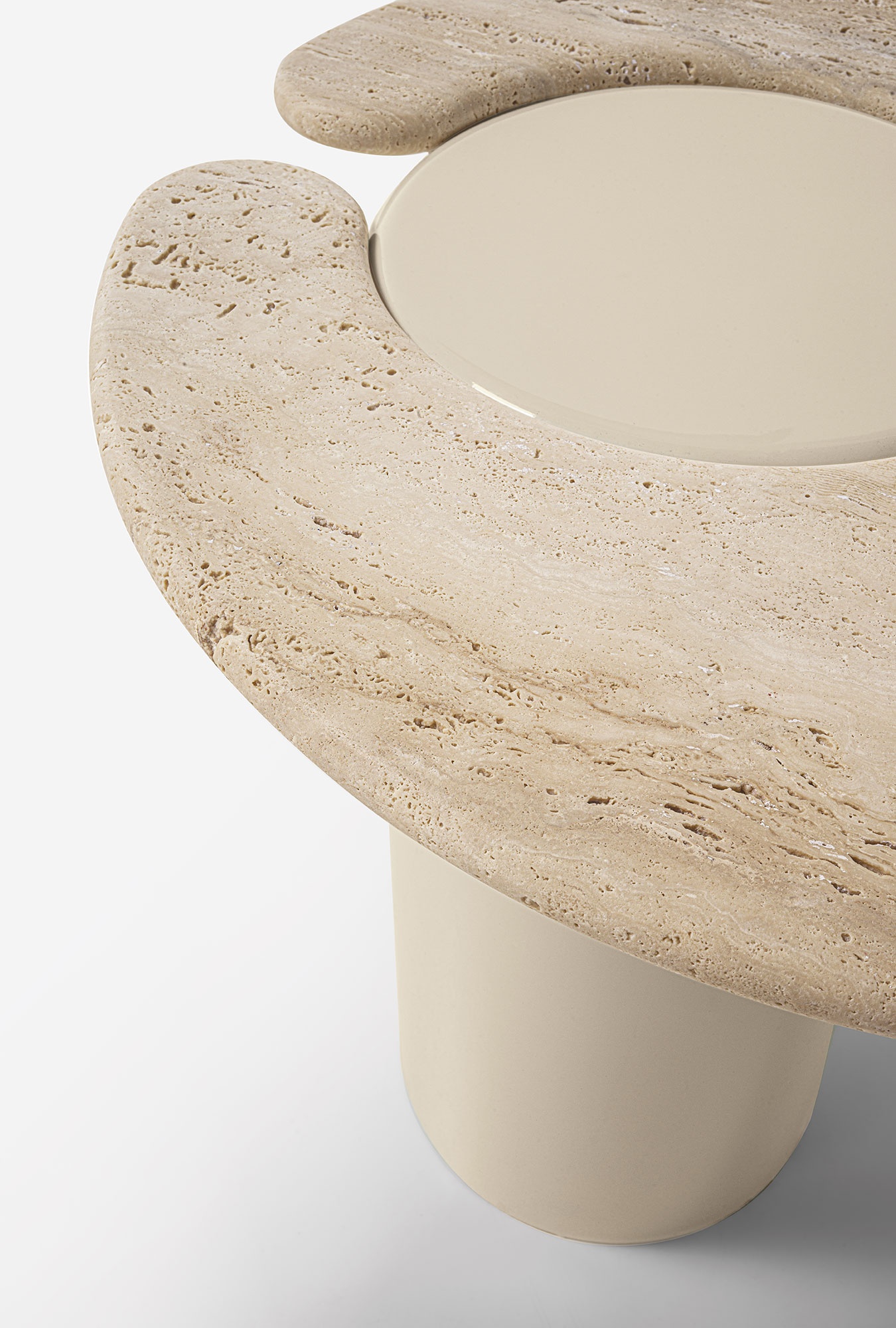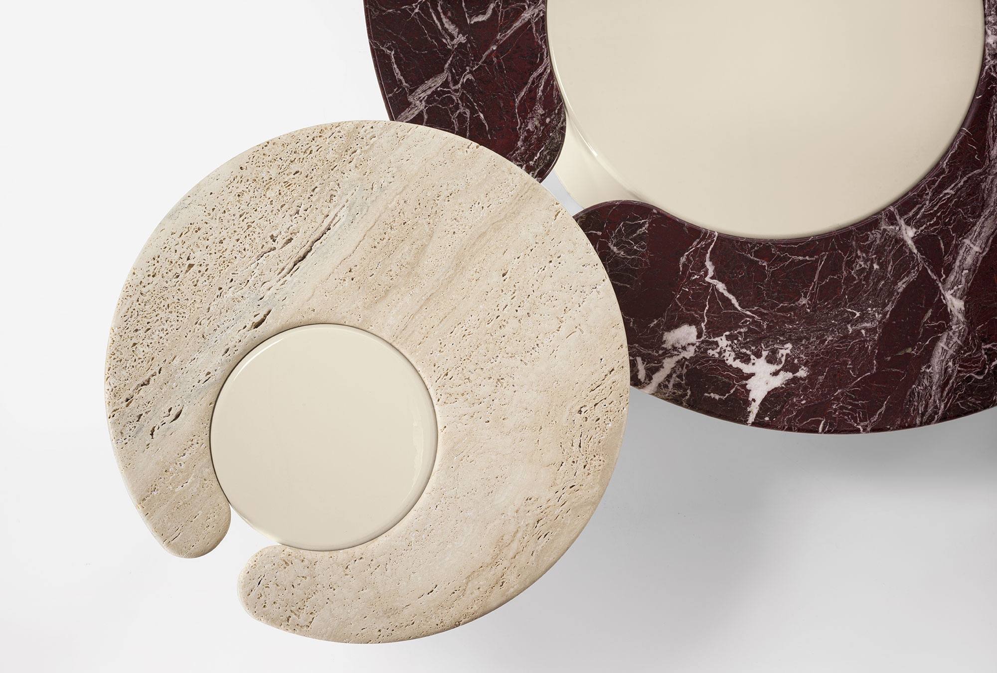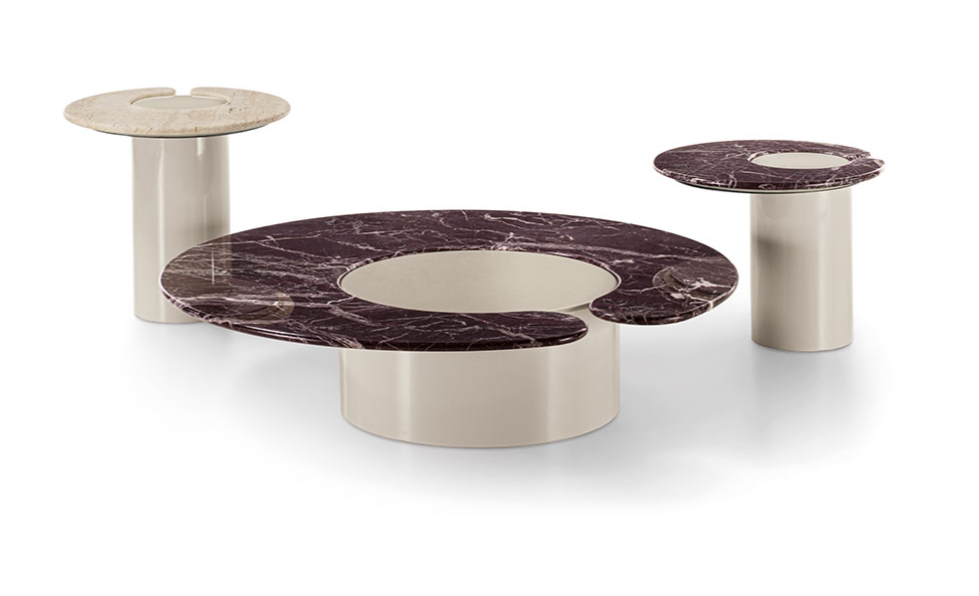 L’imperfezione del cerchio aperto che lascia aperta la porta allo spazio e al movimento per una bellezza che va al di là della forma e che entra nel simbolismo artistico della ricercatezza concettuale. Il tavolino Leni, design di Luca Erba, esalta le sue forme grazie ad una struttura centrale in avvolgenti colori lucidi e con un top in appoggio a forma di un anello aperto dove le estremità si abbracciano, senza mai toccarsi, in un movimento fluido dalle linee sinuose.