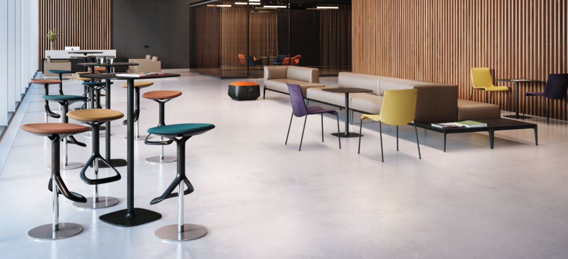 The matching table for our Lox Chair, equally suited to office, restaurant or bar. The standing table is either round or has rounded corners, and the tabletop is available in a choice of glass or Fenix. The footplate elegantly mirrors the form of the tabletop. Perfect for a short standing meeting.