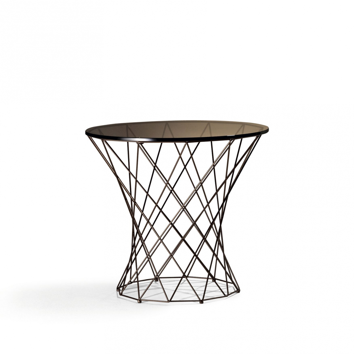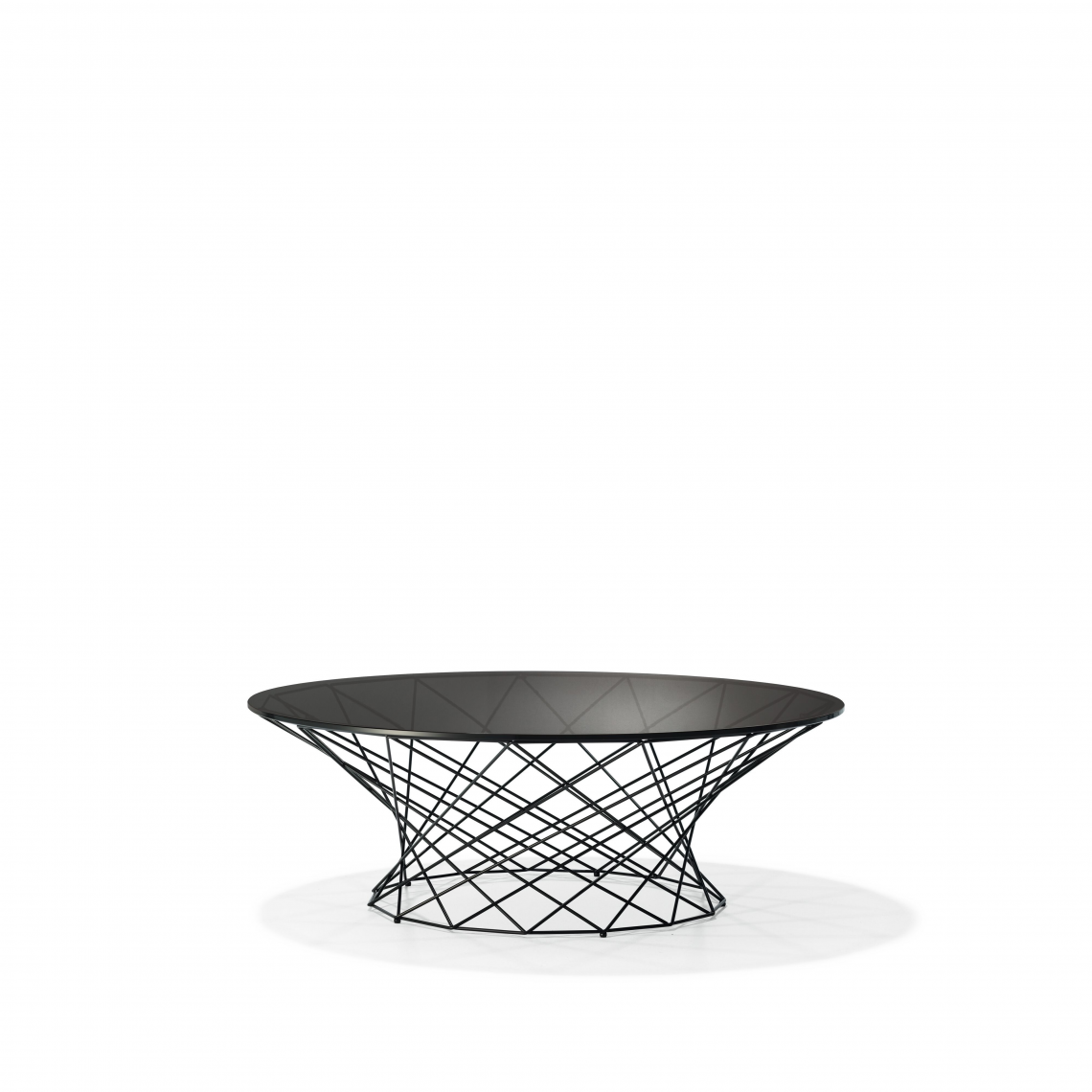 Elegant and brilliant as a piece of jewelry: delicate basketwork supports the round glass top, with its subtle and atmospheric reflection of light. Five different sizes are available, with coated or polished steel frame. Oota Side Table can be used as a sofa table or occasional table.
