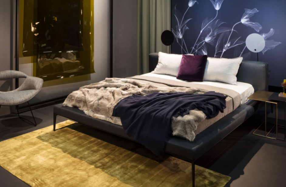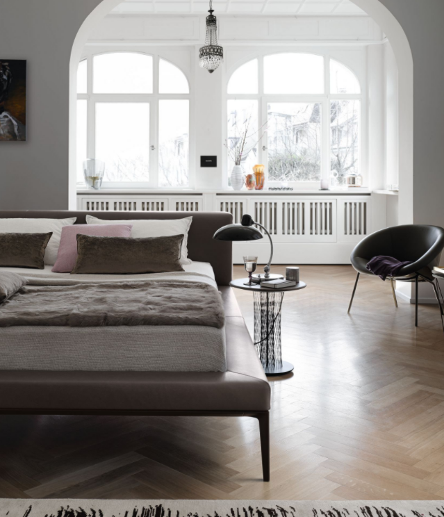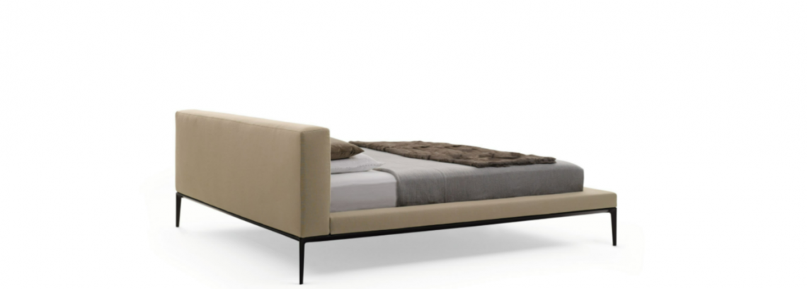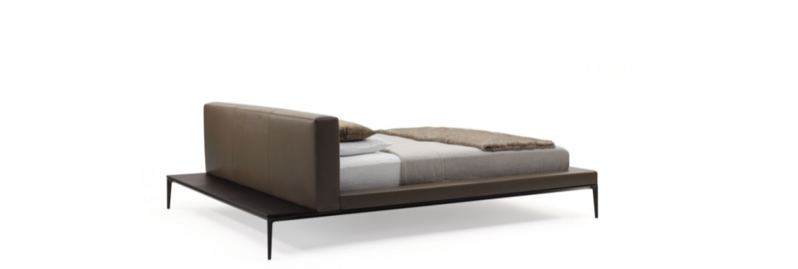A generous bed area on a delicate frame – seemingly weightless, Jaan Bed shapes the room. The headboard and upholstered framework are in sleek leather or natural fabric. Ensuring added comfort are the matt gloss server and the shelf in black glass or striking saddle leather.
