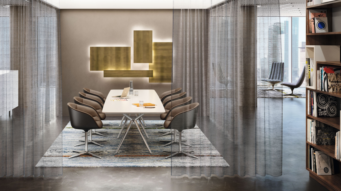 Striking seam patterns fine-tune the upholstery like the seats in a sports car. The shell – with a plastic exterior or completely covered with fabric or leather – ensures outstanding seating comfort. Easy to swivel on a four-star or a five-star base, optionally with castors, the bucket chair provides a different impression from every angle.