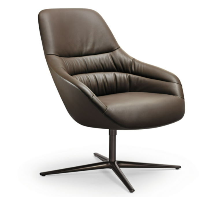 A sumptuous shell chair: the upholstered leather with fine seam patterns and a smoothly rounded star base attest to master craftsmanship.